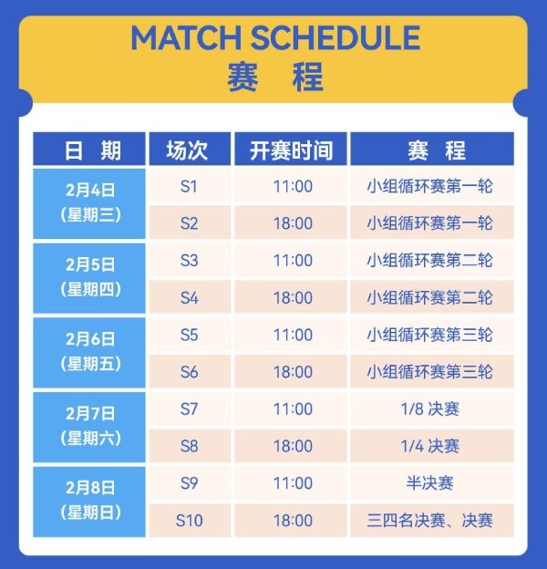 2月8日白天场半决赛、夜场进行季军赛和决赛;