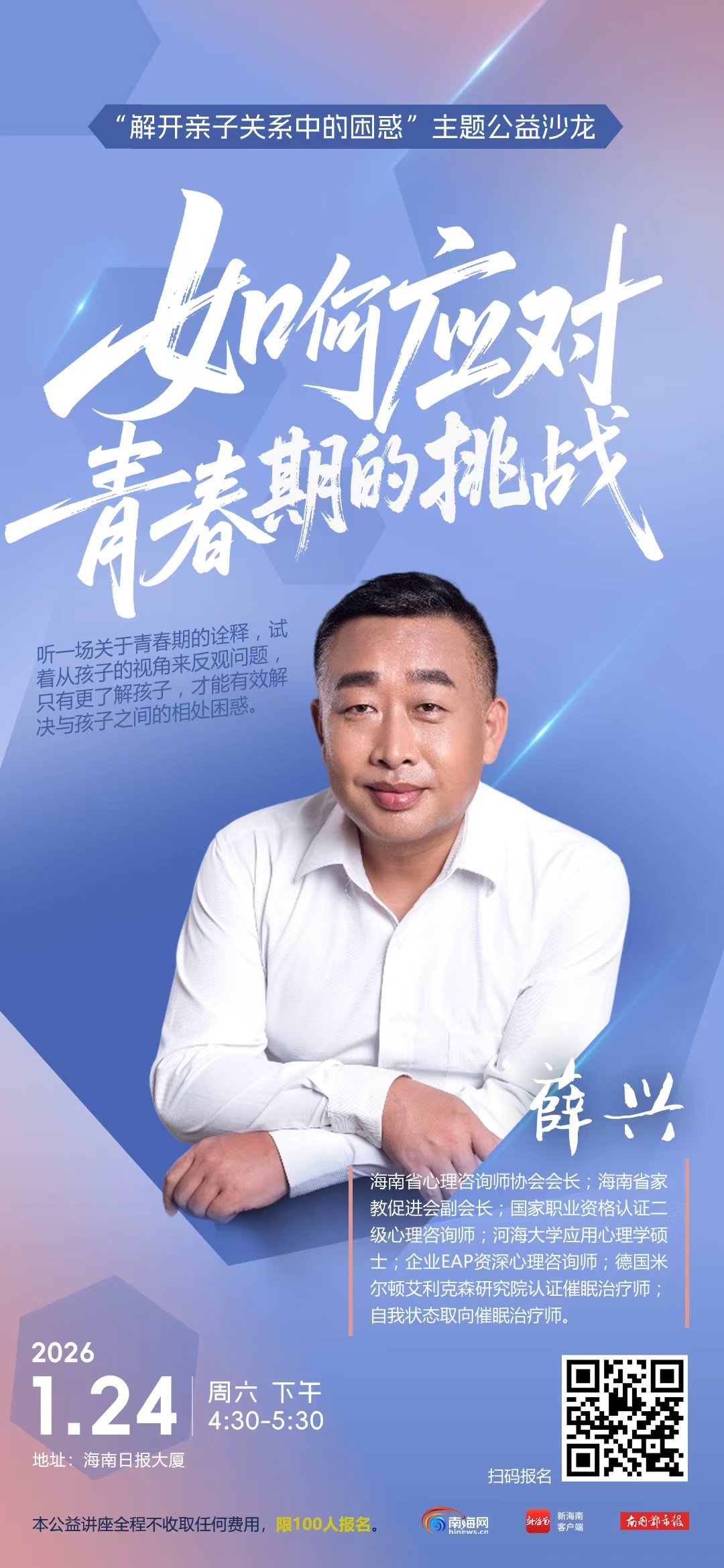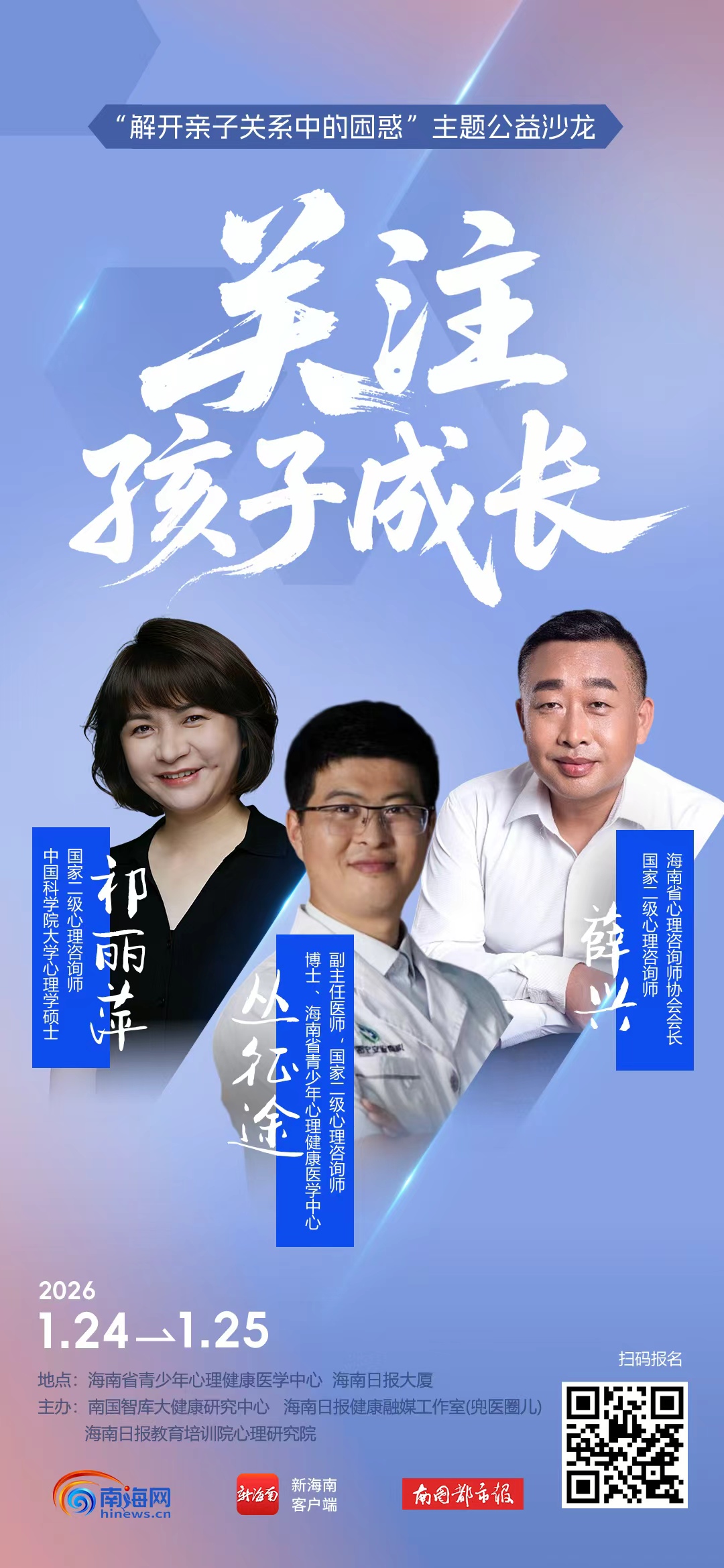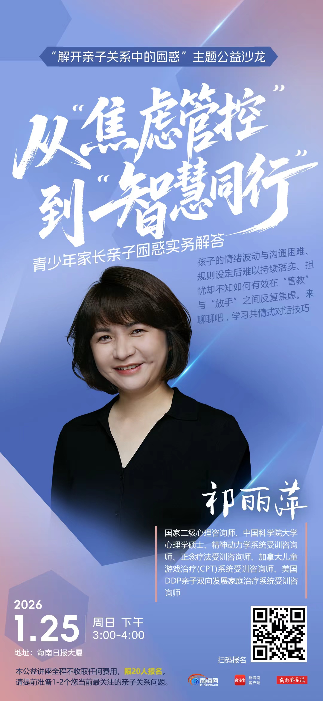 第三场沙龙将于1月25日下午3:00-4:00在海南日报大厦举行,作为小范围沙龙仅限20人报名,将邀请国家二级心理咨询师、中国科学院大学心理学硕士、精神动力学系统受训咨询师祁丽萍,围绕“从‘焦虑管控’到‘智慧同行’——青少年家长亲子困惑实务解答”主题授课。内容聚焦理解情绪化与“叛逆”背后的机制,减少养育盲区,学习共情式对话技巧,替代评判与说教等。为保障交流的深度与效果,参加该场沙龙的亲子家庭需要提前准备一两个关注的亲子关系问题。