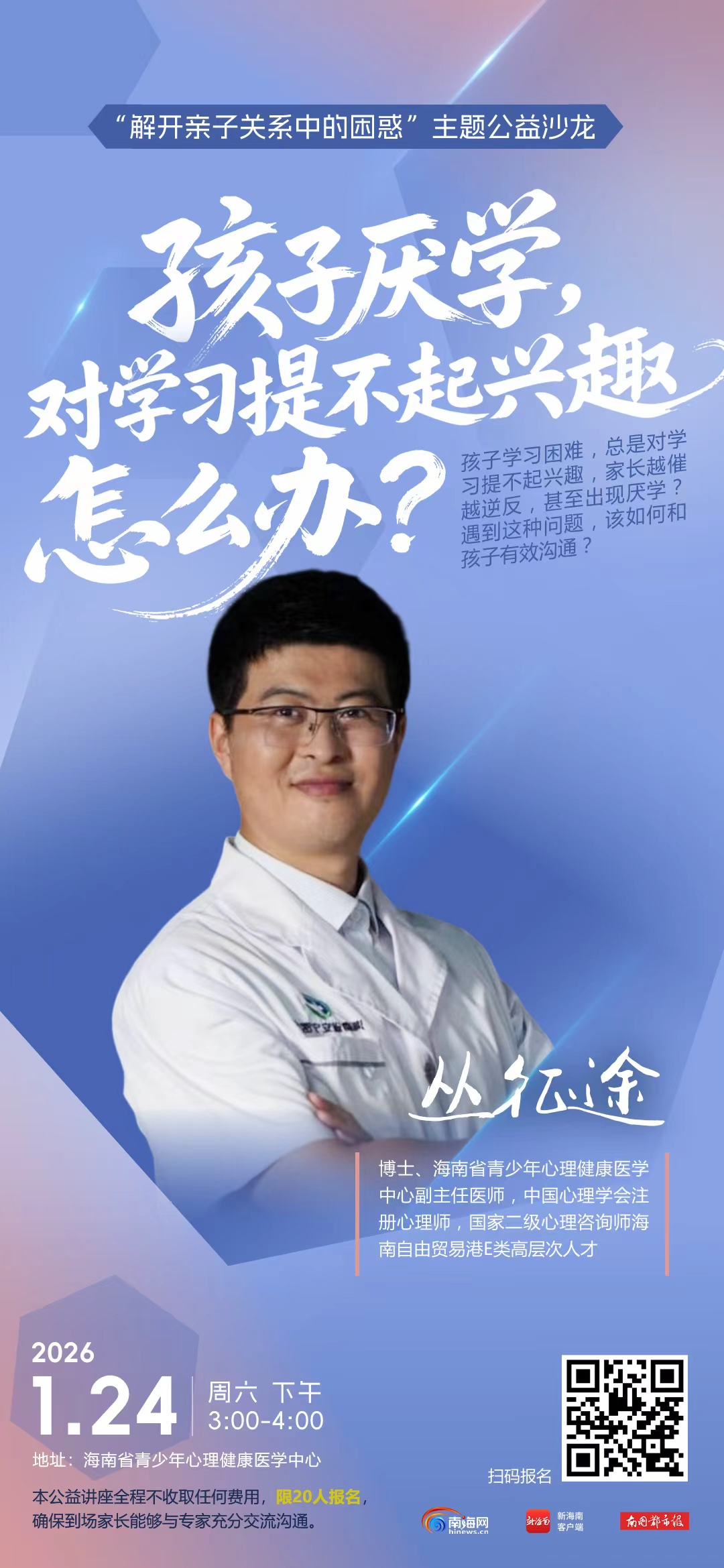 此次活动延续2025年青少年心理沙龙活动的火热,继续关注孩子成长这一热点话题。首场沙龙将于1月24日下午3:00-4:00在海南省青少年心理健康医学中心举办,作为小范围沙龙仅限20人报名参加,围绕“孩子厌学,对学习提不起兴趣,怎么办?”主题,邀请海南省青少年心理健康医学中心副主任医师、中国心理学会注册心理师、国家二级心理咨询师丛征途博士现场授课。届时,丛征途博士将与参加沙龙的亲子家庭充分交流所遇难题,为家长有效和孩子沟通提出建议,改善孩子厌学状况。