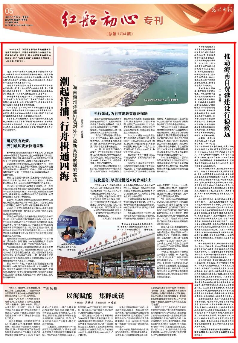 1月23日,光明日报刊发文章《潮起洋浦,行舟楫通四海——海南儋州洋浦打造对外开放新高地的探索实践》,版面图及全文如下↓