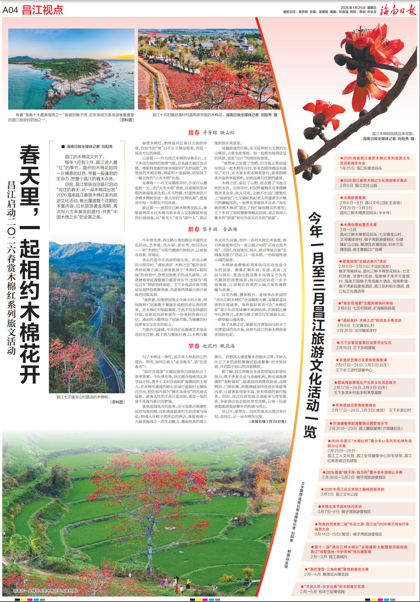 目前,昌江黎族自治县已启动“向往的春天,从一朵木棉花出发”2026海南昌江春赏木棉红系列旅游文化活动,推出覆盖整个花期的丰富内容,拉长旅游黄金周期,再次向八方来客发起邀约,共赏“中国木棉之乡”的全景之美。