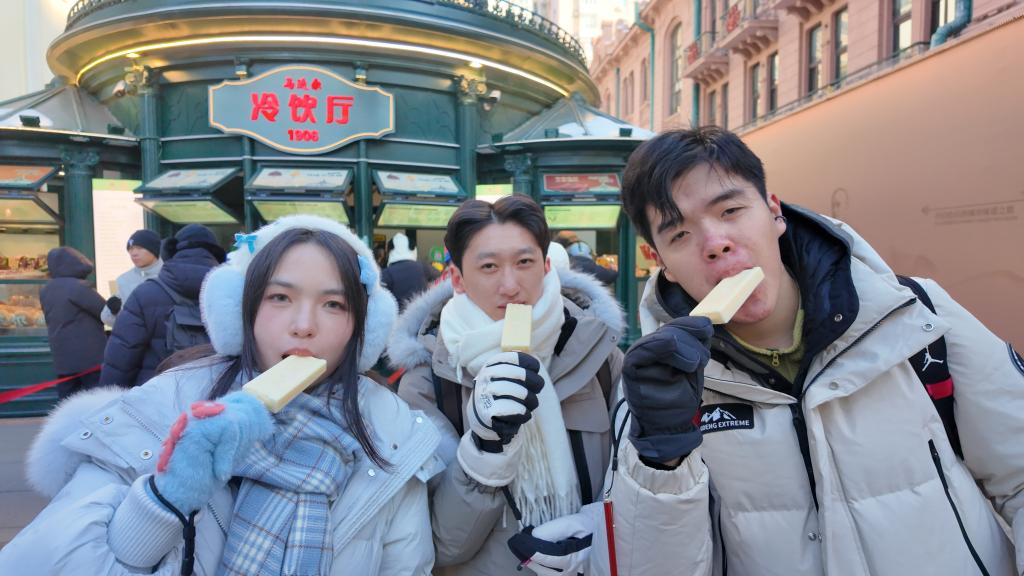 “在这么冷的天气吃冰棍是比较特别的体验。”“冬天就得配冰棍。”“听说哈尔滨这个马迭尔冰棍很有名,我就非常想来尝试一下。”