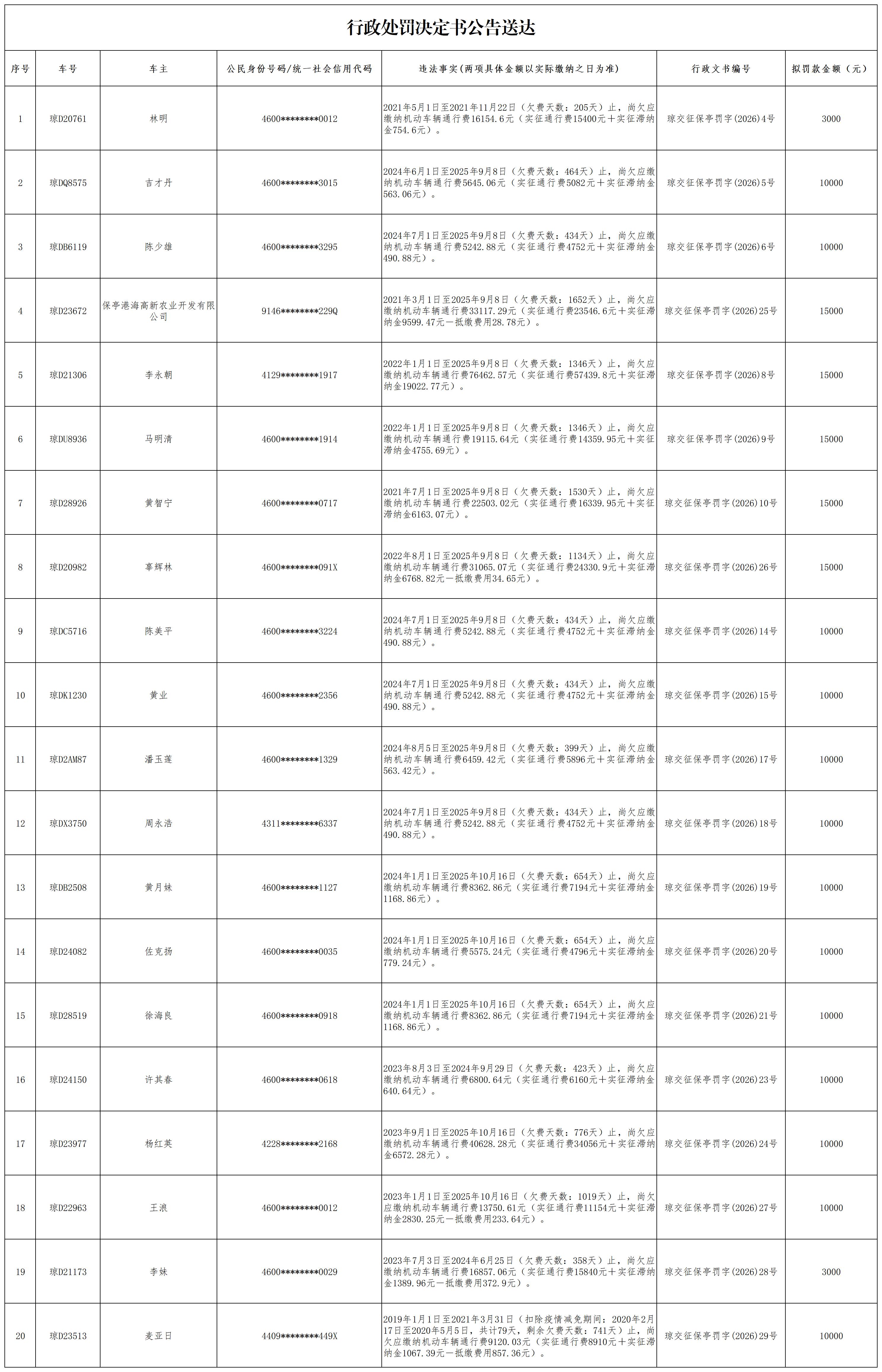 根据《关于调整机动车辆通行附加费征收标准的通知》(琼价费管〔2013〕153号)之规定,柴油机动车辆缴费义务人需按核定吨位,以220元/吨·月或11元/吨·日为标准,按时足额缴费。部分欠缴机动车辆通行附加费当事人未及时足额缴纳机动车辆通行附加费,违反了《海南经济特区机动车辆通行附加费征收管理条例》第二条、第五条、第七条、第九条、第十一条的规定,本机关将根据《海南经济特区机动车辆通行附加费征收管理条例》第二十六条之规定对违法行为当事人作出处以罚款的处罚决定。现因本机关采取其他方式向下列违法行为当事人(详见《行政处罚决定书公告送达》清单)送达《行政处罚决定书》无果,特依法予以公告送达,公告期为30日,请违法行为当事人自公告之日起30日内前往海南省交通规费征稽局保亭分局领取《行政处罚决定书》,公告期满即视为送达。