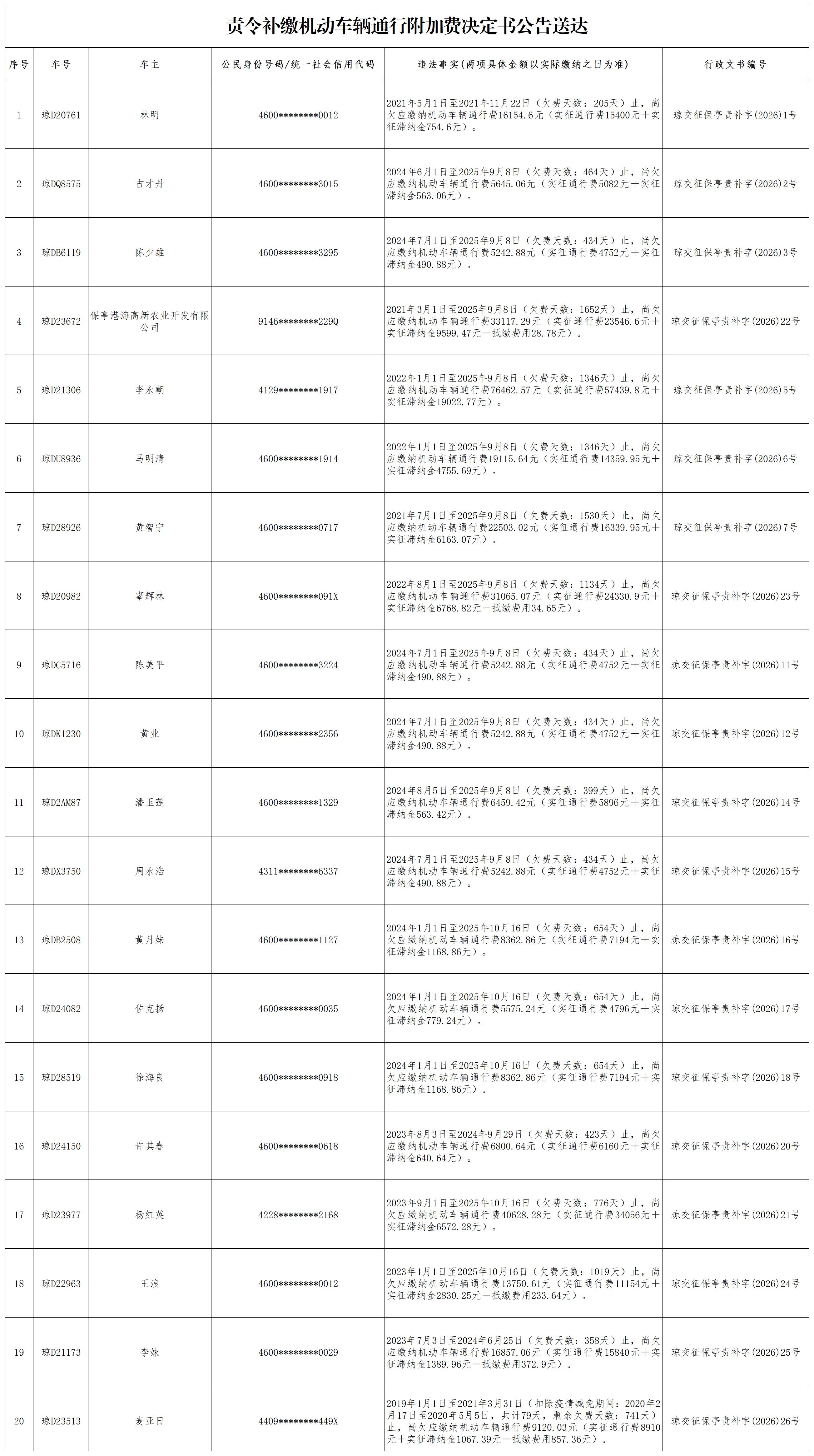 经调查,部分欠缴机动车辆通行附加费的当事人未按时履行缴费义务。根据《海南经济特区机动车辆通行附加费征收管理条例》以及《关于调整机动车辆通行附加费征收标准的通知》(琼价费管〔2013〕153 号)的相关规定,本机关将对欠缴机动车辆通行附加费当事人作出相应处理,具体情况如下: