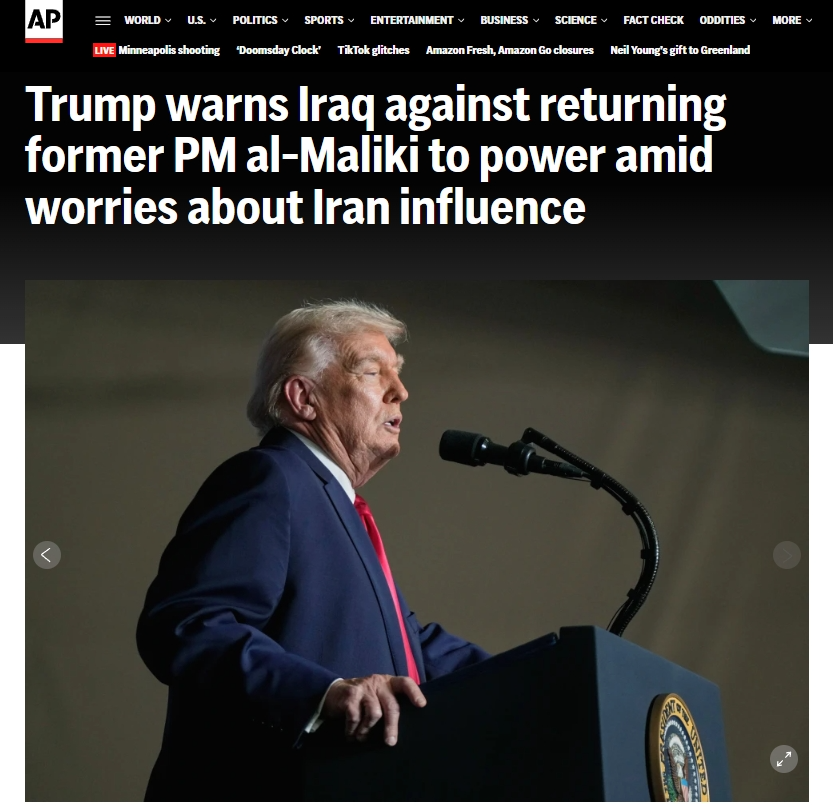 美国总统特朗普当地时间1月27日在社交媒体发文称,如果伊拉克前总理努里·马利基再度当选总理,美国将不再“援助”伊拉克。