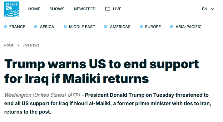 特朗普27日直接点名发出威胁。他在社交媒体上发文称,如果马利基当选总理,美国将不再援助伊拉克,“如果我们不援助,伊拉克就毫无机会取得成功、繁荣或自由”。