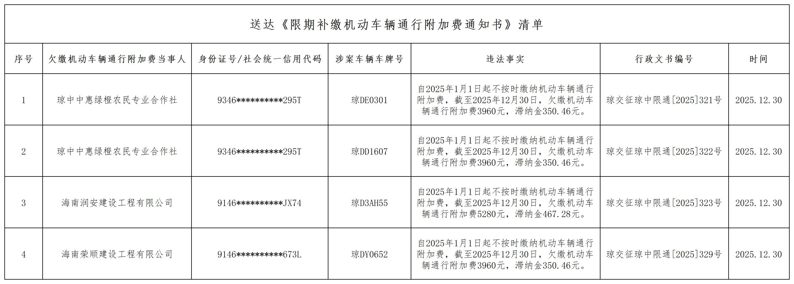 因下列欠缴机动车辆通行附加费当事人不按时缴纳机动车辆通行附加费(具体欠费信息详见附表一:送达《限期补缴机动车辆通行附加费通知书》清单),违反了《海南经济特区机动车辆通行附加费征收管理条例》第九条、第十一条的规定,根据《海南经济特区机动车辆通行附加费征收管理条例》第二十六条的规定,向下列欠缴机动车辆通行附加费当事人送达《限期补缴机动车辆通行附加费通知书》,限下列欠缴机动车辆通行附加费当事人在收到本通知书之日起十日内到本单位补缴应缴费额、滞纳金(两项具体金额以实际缴纳之日为准)。现因本单位采取其他方式无法向下列欠缴机动车辆通行附加费当事人送达《限期补缴机动车辆通行附加费通知书》,特依法予以公告送达,公告期为30日,请下列欠缴机动车辆通行附加费当事人自公告之日起30日内来海南省交通规费征稽局琼中分局领取《限期补缴机动车辆通行附加费通知书》,公告期满即视为送达。