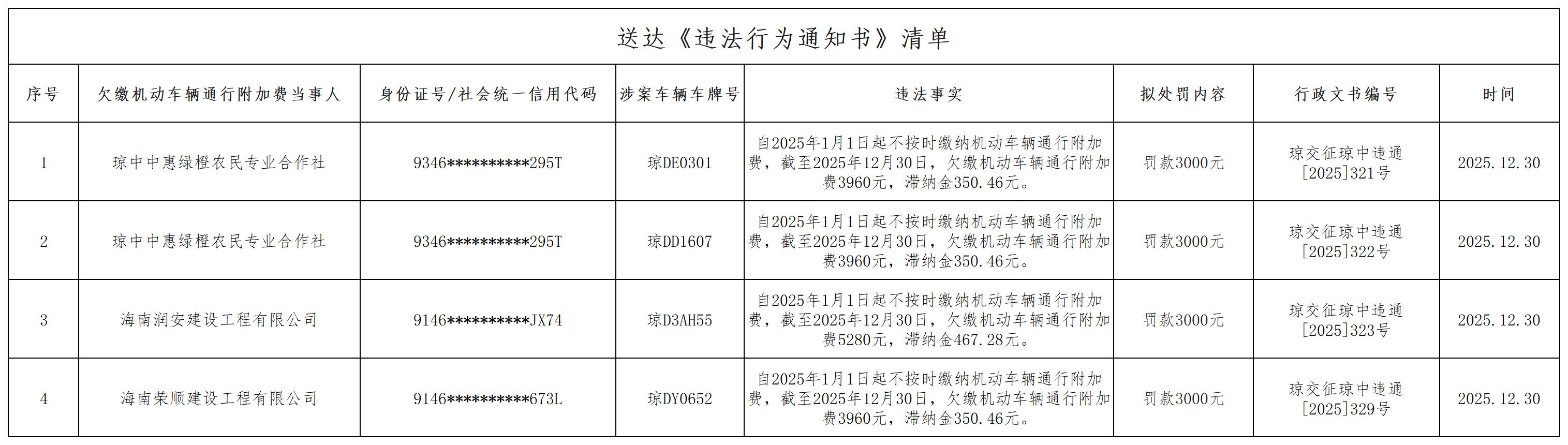 海南省交通规费征稽局琼中分局关于送达《限期补缴机动车辆通行附加费通知书》《违法行为通知书》的公告