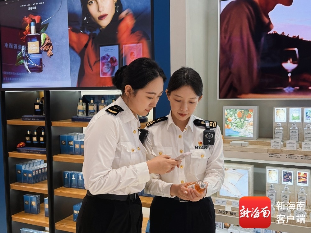 海关关员在中免凤凰机场免税店核验免税商品试用装溯源码。海口海关供图