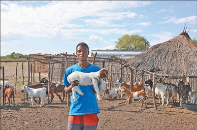 “村村通”项目的实施助力伦杜市姆博拉村畜牧业发展。图为在姆博拉村,村民卡西安展示自己饲养的小羊。本报记者 戴楷然摄