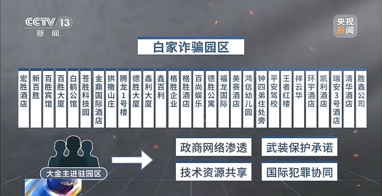 白家也在短短几年里,通过政商网络渗透、武装保护承诺、技术资源共享,以及国际犯罪协同等手段迅速建立百胜、苍胜、腾龙、鑫百利等41个电诈园区,成为在电诈领域起步晚,发展快,金主依赖性更强的地方家族势力。