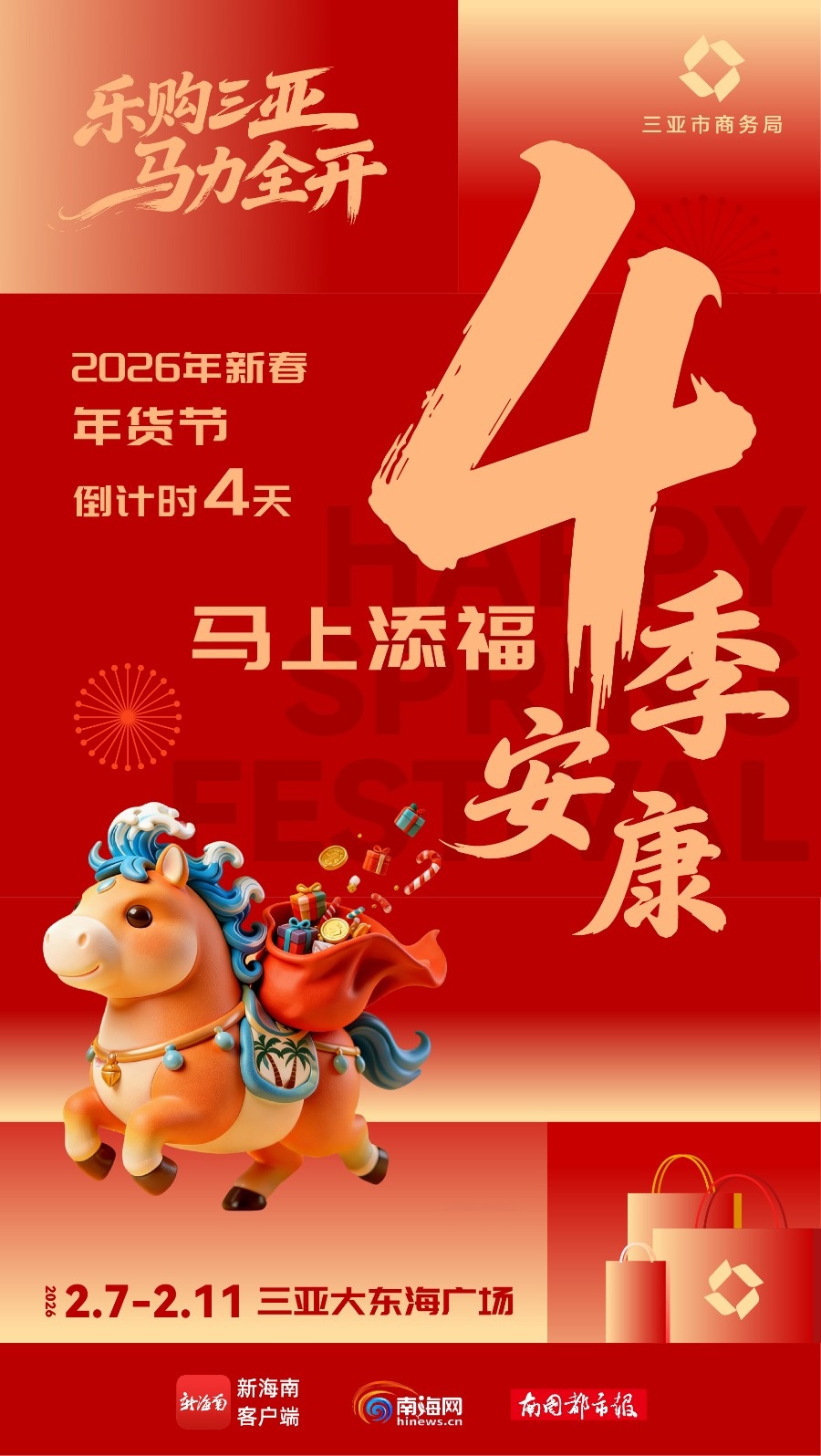 距“2026年三亚年货节”开幕还有4天。这场由三亚市商务局主办,南海网、南国都市报承办的新春消费盛宴,将于2月7日在三亚大东海广场启幕,以“乐购三亚 马力全开”为主题,打造“购、品、赏、玩”一站式年货体验。