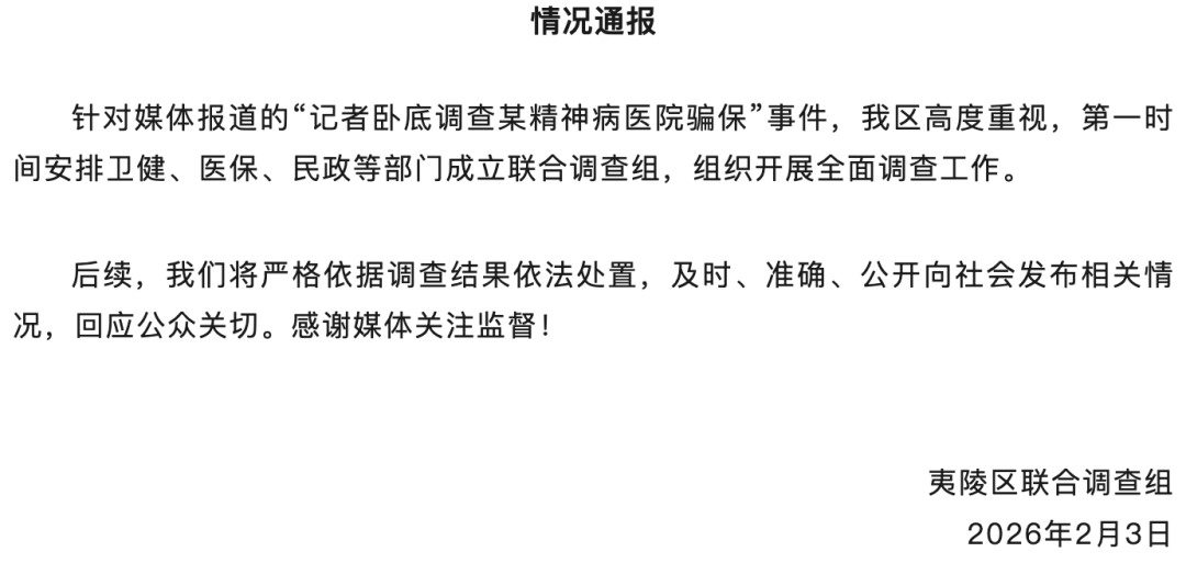针对媒体报道的“记者卧底调查某精神病医院骗保”事件,夷陵区高度重视,第一时间安排卫健、医保、民政等部门成立联合调查组,组织开展全面调查工作。
