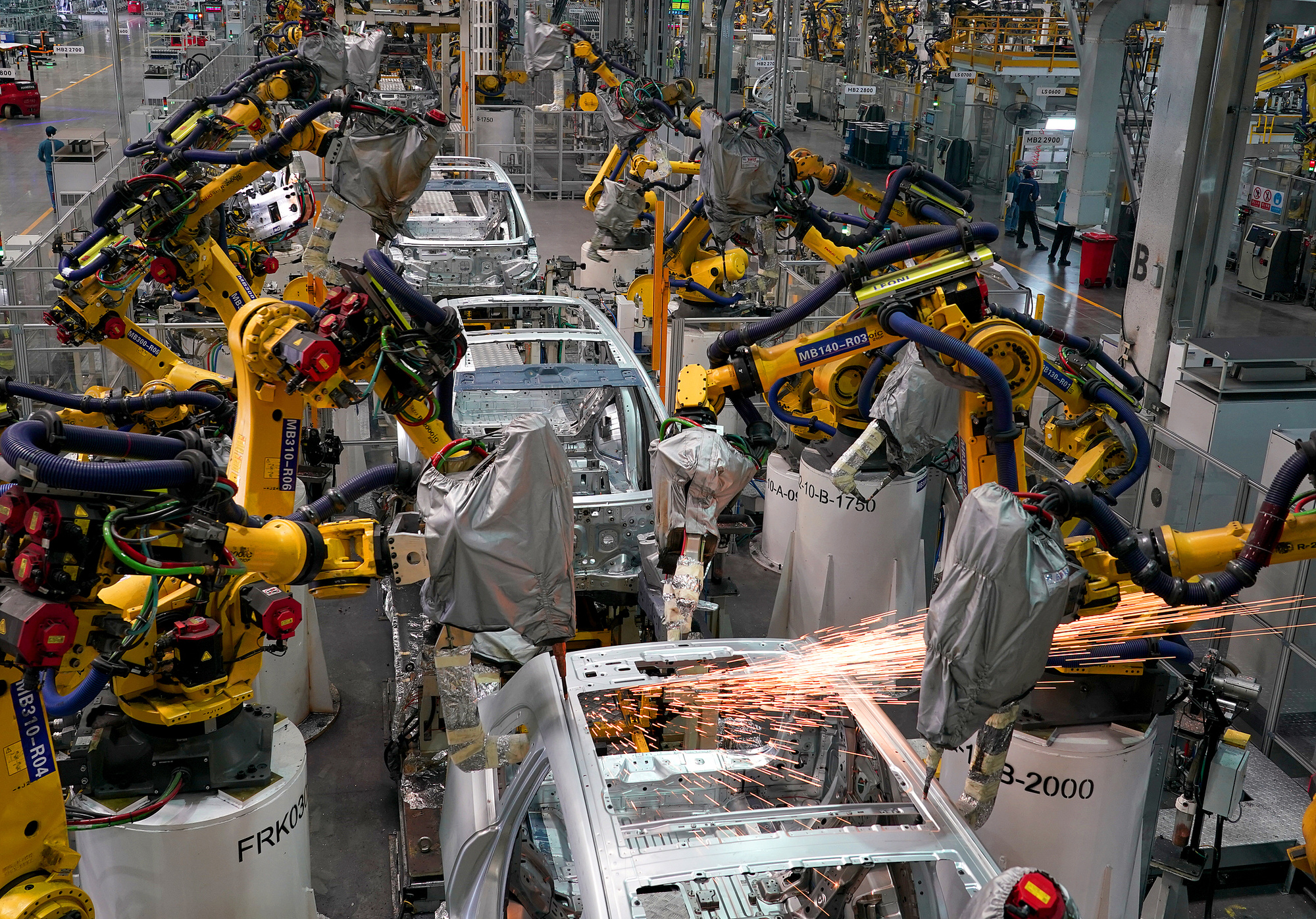 重庆国际物流枢纽园区的超级工厂内,工业机器人进行焊接作业