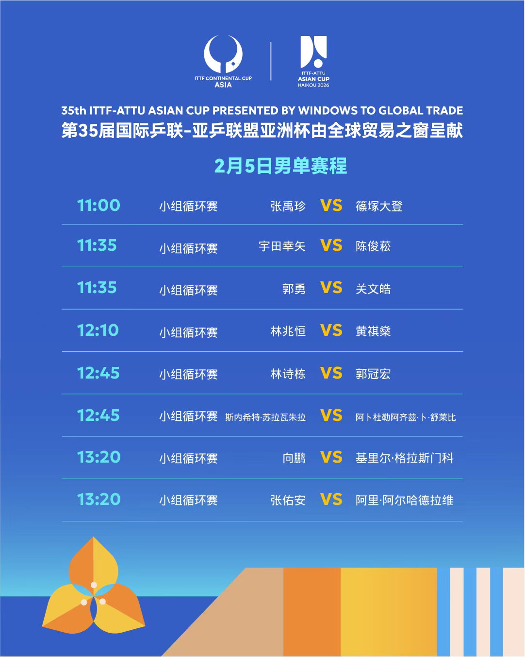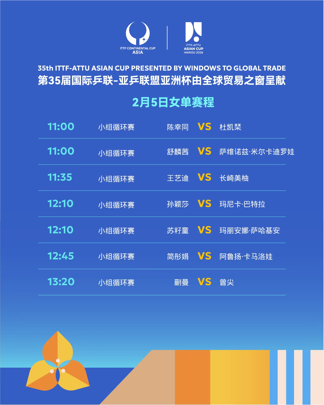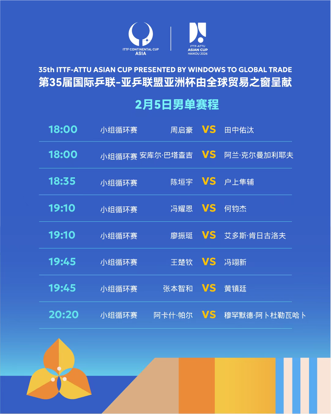2月4日,第35届国际乒联-亚乒联盟亚洲杯在海口五源河体育馆正式开赛,首个比赛日进行了男女单打小组赛第一轮较量。中国乒乓球队12名选手全员登场,凭借稳定发挥与强劲实力豪取全胜,为晋级16强奠定坚实基础,用完美表现点燃主场观众热情。