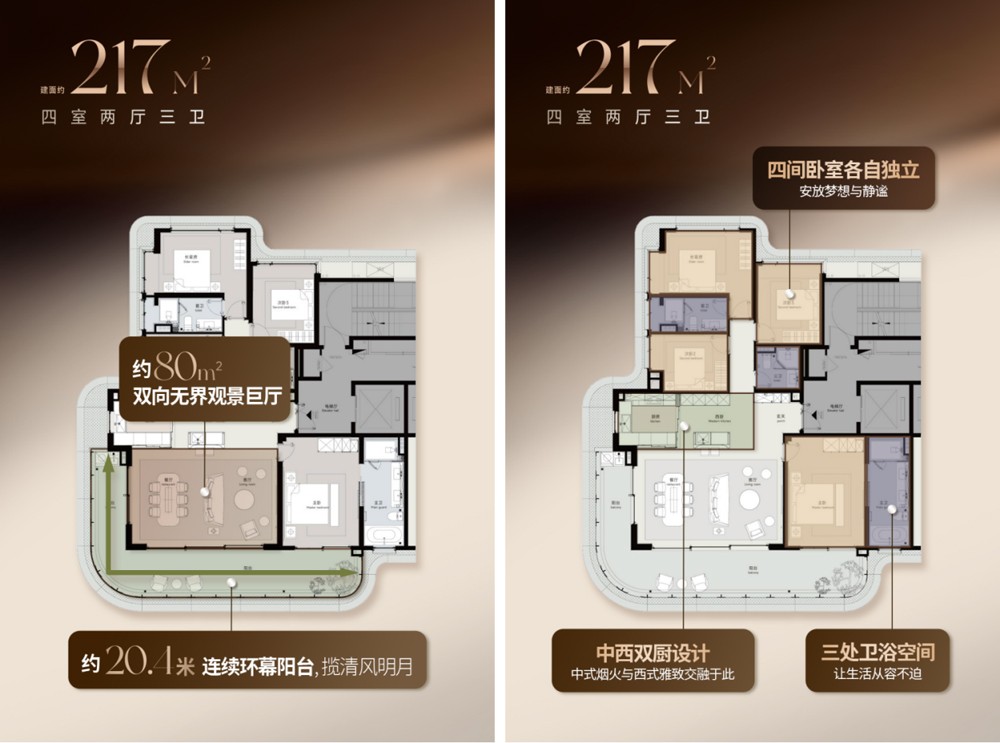 家族平层(建面约217-273㎡):以约10.8米南向超级横厅为核心,连接进深达2.4米的环幕阳台,形成IMAX级全景瞰海视野。空间布局充分考虑多代共居的需求,实现家庭成员亲密互动与独立私密的平衡,是传承与共融的家族主场。