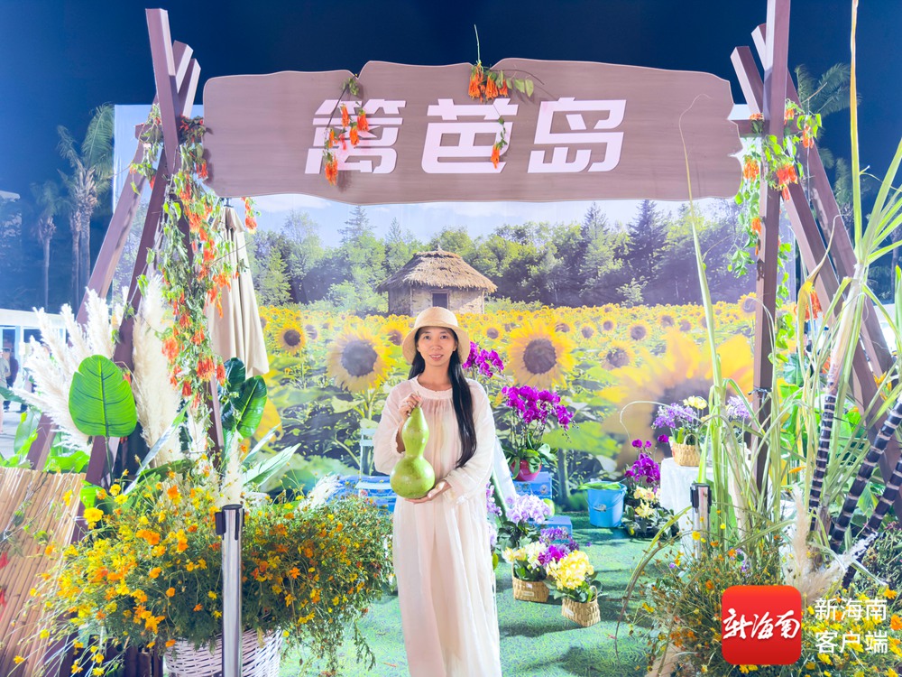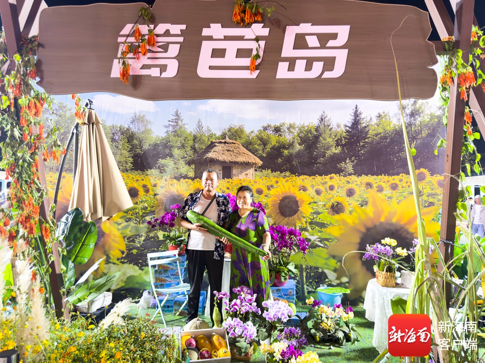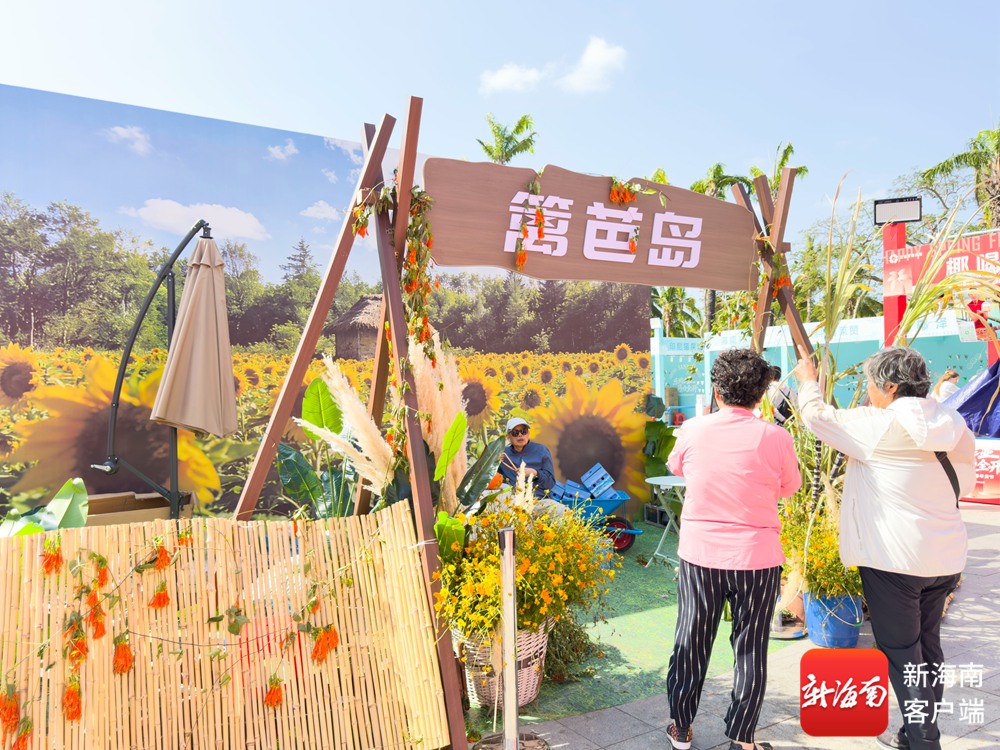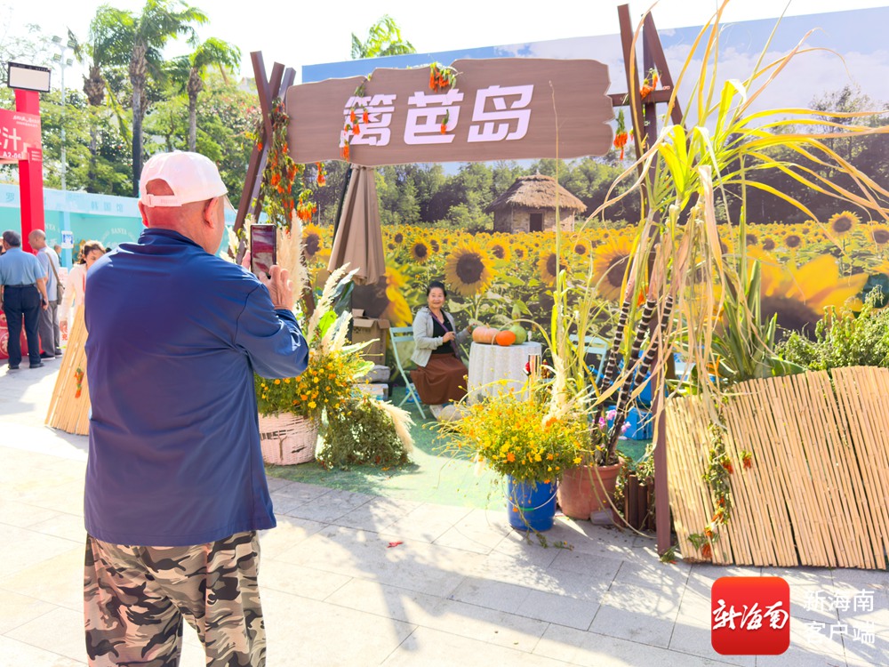 “篱笆岛”展台以“鲜花+水果+农特产品”融合的田园模式打造,兰花、硫华菊等鲜切花与现摘水果、特色蔬菜错落摆放,背景的向日葵花海与茅草屋造景,让市民游客仿佛置身海岛田间。
