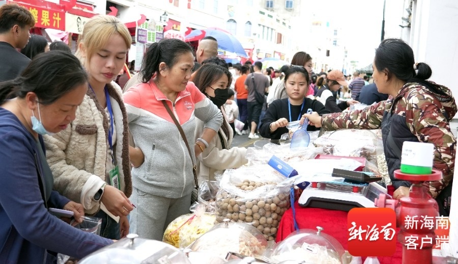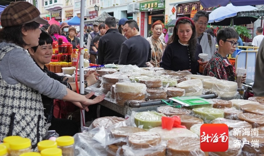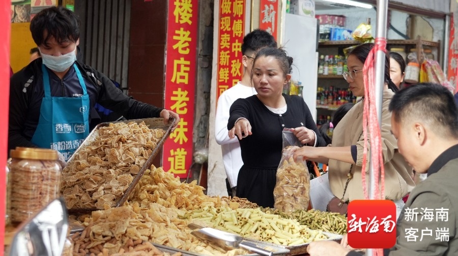 最热闹的还属零食干果区。孩子们踮着脚尖,眼睛亮晶晶的,盯着椰子糖、菠萝干、红糖年糕。来自东北的新海口人李女士正往袋里装腰果:“在海南过年,要买些热带特产寄回老家。”