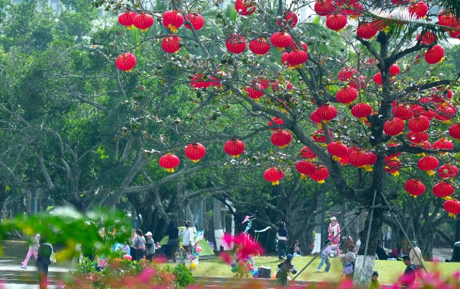在万绿园红灯笼高高挂,年味浸染椰城。记者 汪承贤 摄