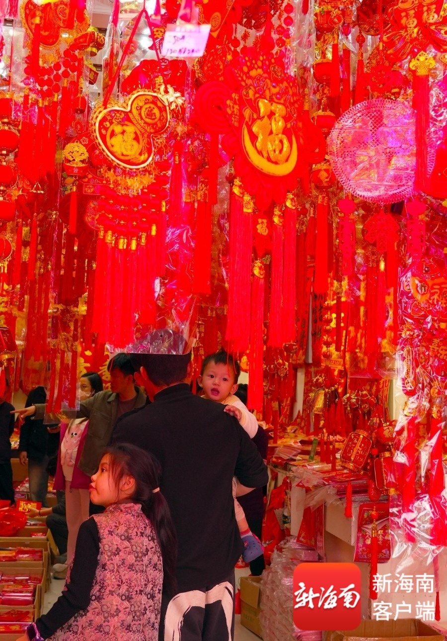 在解放东路的年货集市早已人声鼎沸。市民们拎着编织袋,穿梭在琳琅满目的摊位间。“阿妹,这年糕甜而不腻,买点回去啦?”卖年糕的阿婆用海南话热情招呼。旁边春联摊位前围满了人,金粉在红纸上流淌出“福满人间”“春回大地”的吉祥话,墨香混着椰香飘散开来。