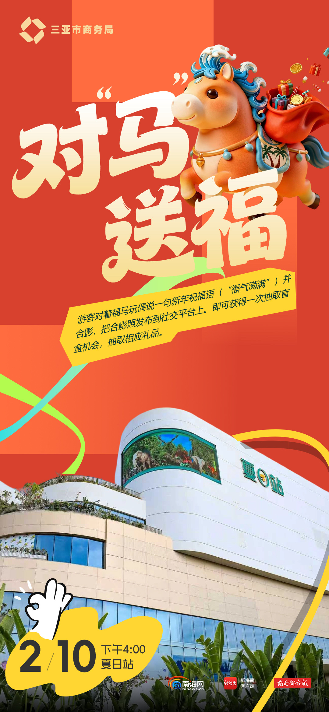 南海网、新海南客户端2月9日消息(记者 林师堂)岁末年味渐浓,马年新春将至。为持续点燃新春消费热情,丰富市民与游客节日体验,“乐购三亚 马力全开”2026年新春年货节特别推出福气“马”上抓——偶遇打卡系列互动活动,将于2月10日下午4点在三亚夏日站惊喜开启,以萌趣互动与新春好礼,传递马年吉祥福气,点亮海岛新春仪式感。