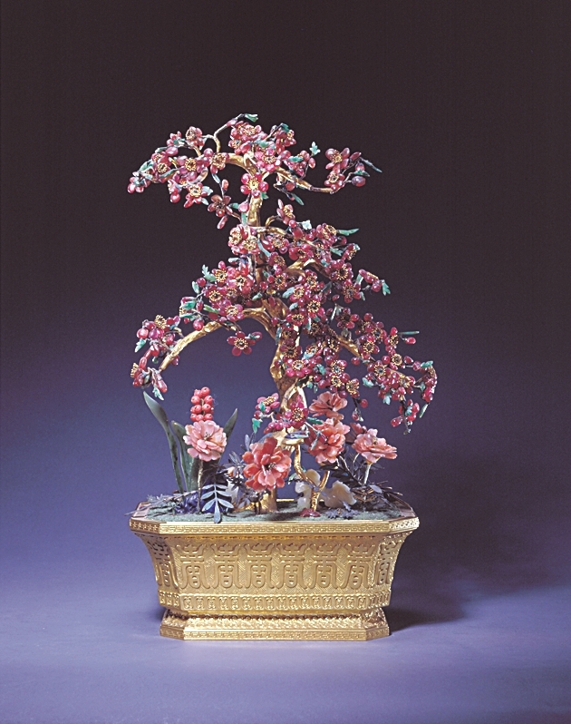 我们可以看几个故宫博物院藏的像生盆景实例。金长方盆红宝石梅花盆景,盆通体以卍字不到头纹为地,凸起寿字一周,谐音“万寿”。景为梅树一株,枝干木胎,包裹一层铜镀金皮,花瓣为红宝石与尖晶石制成,金制花蕊,翠制叶片。梅有报春之意,又是高洁品格的象征。其周围衬点翠叶玛瑙茶花、玉叶珊瑚珠万年青、铜镀金嵌宝石灵芝及青金石、玛瑙湖石等,错落有致,主次分明,为清宫祝寿工艺品中的代表。
