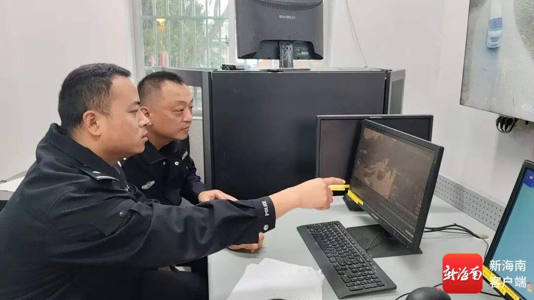 民警在调取监控寻找走失孩子的父母。图片由白沙公安局提供