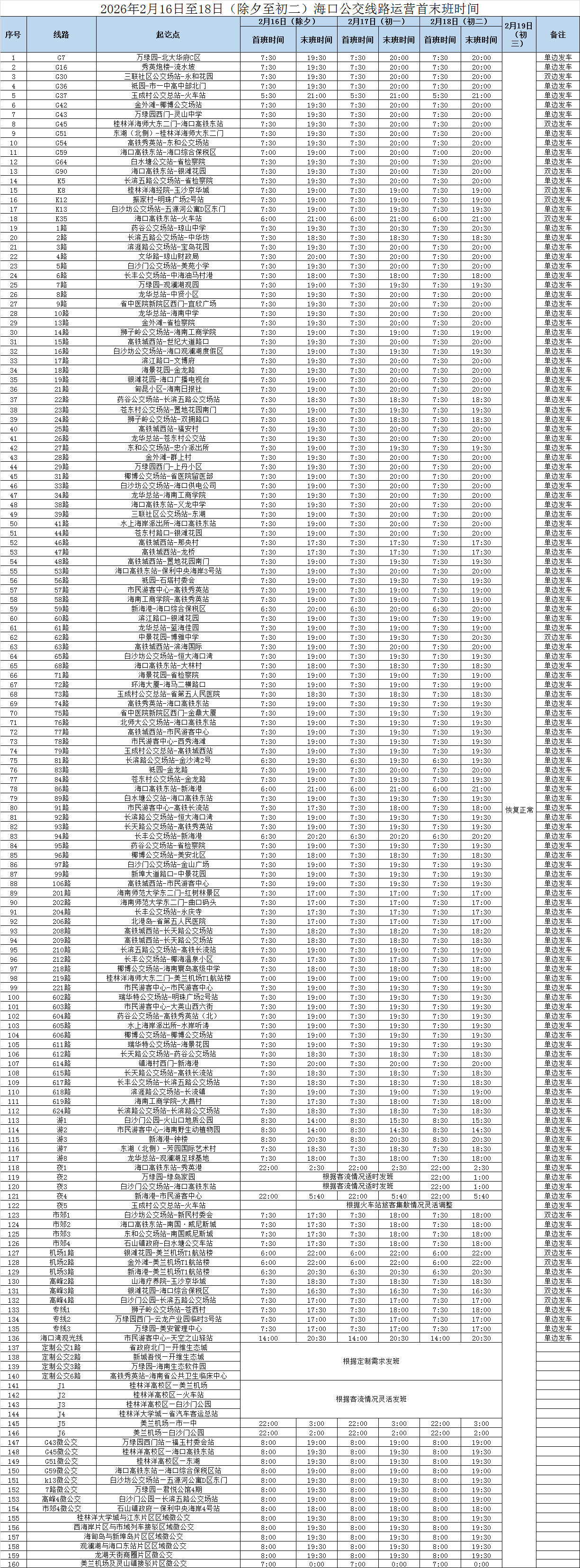 附:2026年2月16日至18日(除夕至初二)海口公交线路运营首末班时间