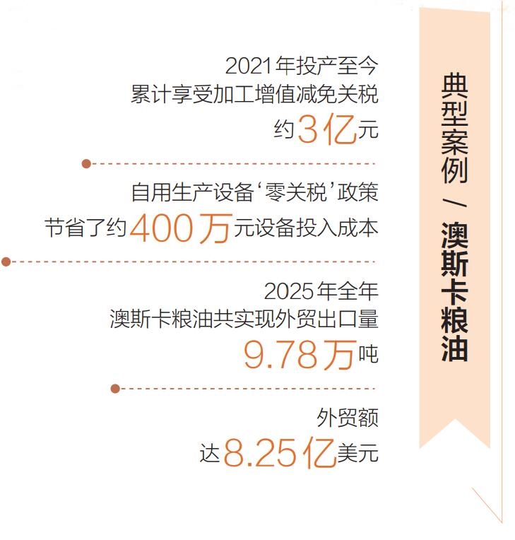 同样享受政策红利的还有澳斯卡粮油。作为一家集食用植物油、植物蛋白和磷脂产品研发、生产、加工和国内外产、贸、销为一体的综合型粮油加工企业,澳斯卡粮油主要从巴西、加拿大等地进口原料,在洋浦加工成粮油产品后,销往海南市场和其他省份。2021年7月23日,澳斯卡粮油成功完成全国首单加工增值30%免关税业务。