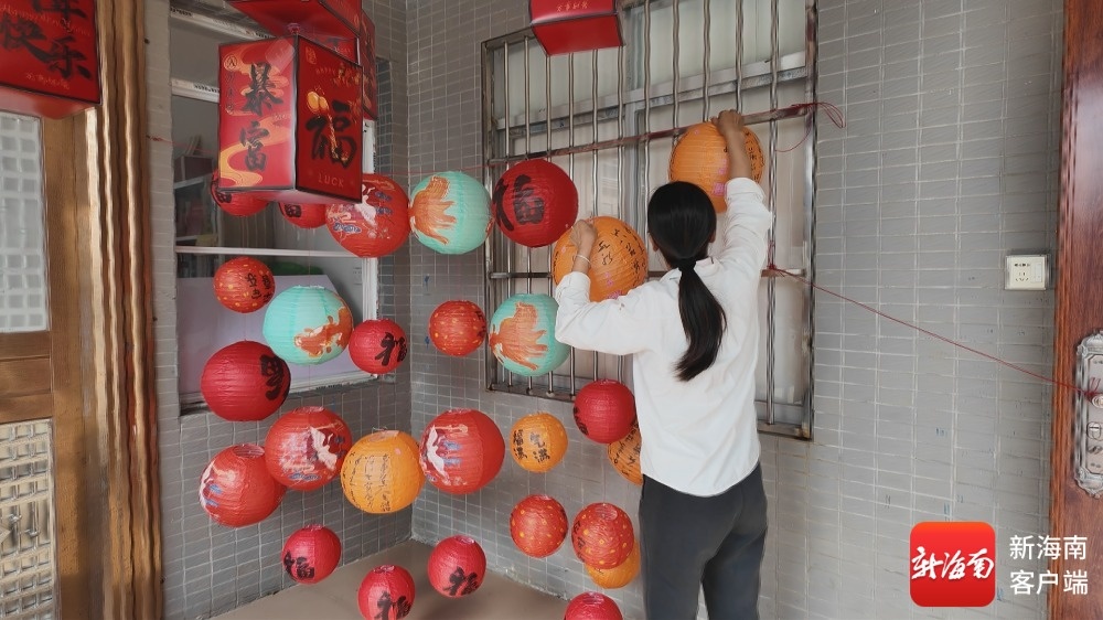 林梅燕正在村史馆前挂起春节的红灯笼。记者 郑光平 摄