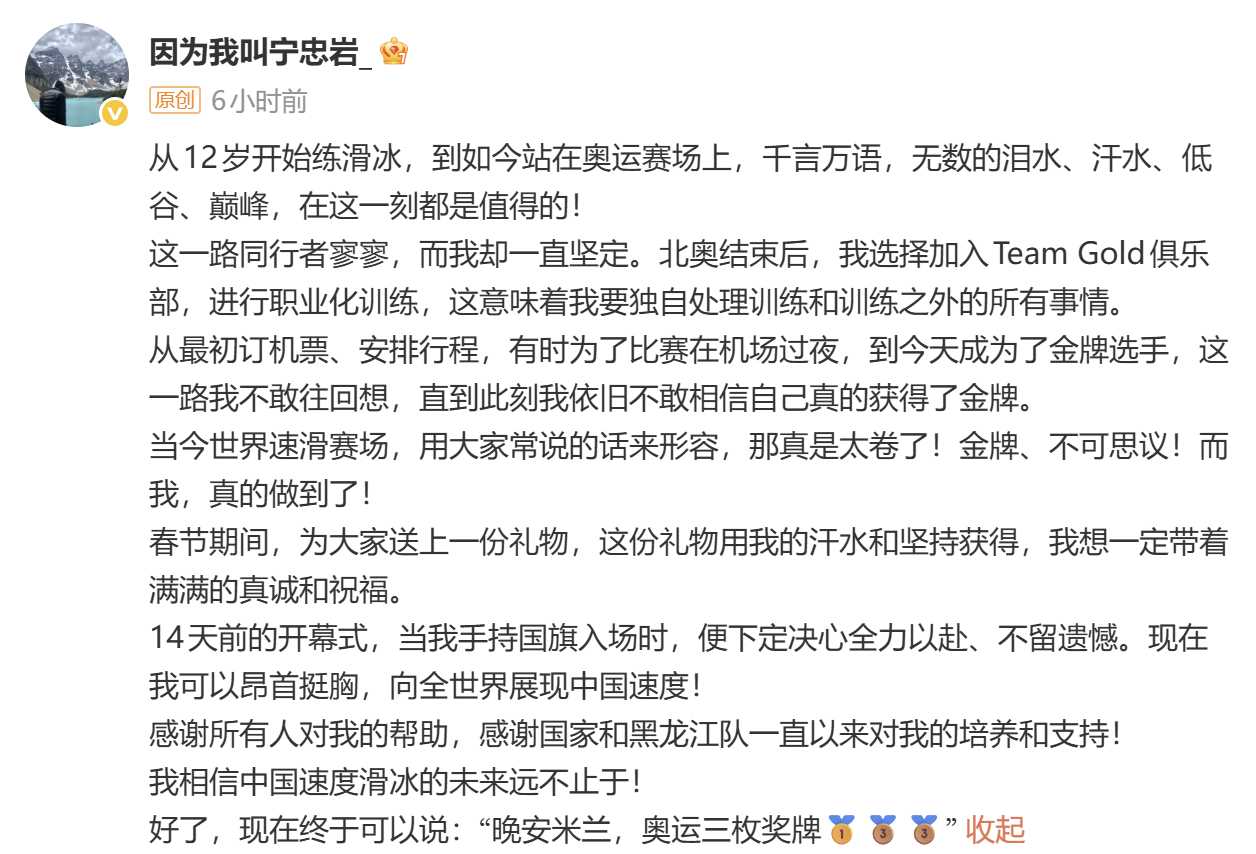 在打破奥运纪录夺得冬奥会速度滑冰男子1500米冠军后,中国选手宁忠岩发布微博: