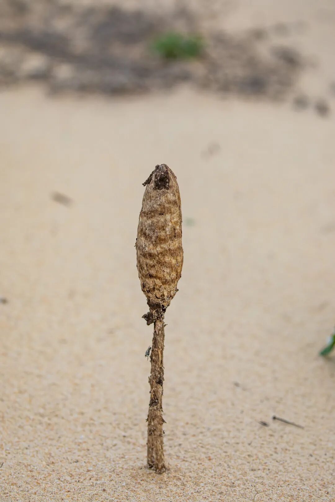 与常见伞状展开的蘑菇不同,海滨轴灰包的伞面呈闭合状态。这种被称为“腹菌”的子实体形态,被推测是为适应极端环境的重要演化特征。该物种高度可达23厘米,包被呈浅棕至深褐色,表面覆有毛状或鳞片状结构。成熟后,包被开裂或脱落,散播出大量孢子粉,且会随风传播。其担孢子壁厚达2至3微米,个头明显大于其他同类真菌。