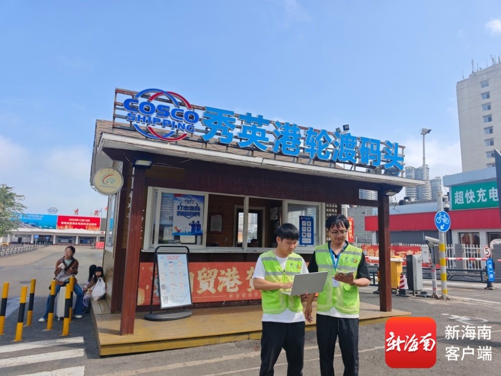 海南电信工作人员在秀英港轮渡码头进行网络信号检测。海南电信供图