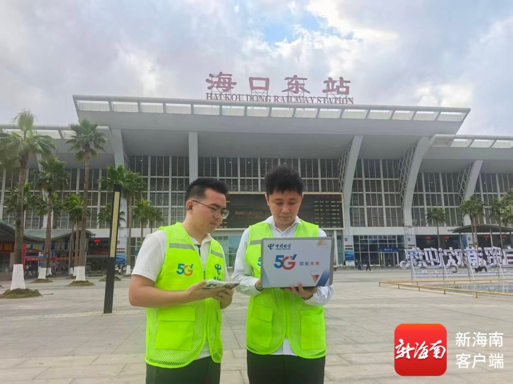 海南电信工作人员在海口东站进行网络保障。海南电信供图
