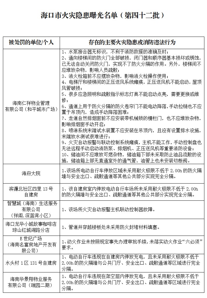 海口市消防救援支队在监督检查中发现,海南仁祥物业管理有限公司(和平城市广场)、海府大院、滨濂北社区四里13号自建房、智慧城(海南)生活服务有限公司(祥阁.深蓝湾小区)、海口龙华小城故事咖啡店琼山红城湖路分店、E世纪广场(海南名富房地产开发有限公司)、水头村1区131号自建房、海南华景翔物业服务有限公司(瑞园二期)等8家单位及个人,存在电动自行车停放区域未采用耐火极限不低于2.00h的防火隔墙与安全出口和疏散通道等其他公共部分实现完全分隔、未落实动火作业、消防设施设备未保持完好有效等消防安全隐患问题,其中海南仁祥物业管理有限公司(和平城市广场)存在重大火灾隐患已挂牌督办。