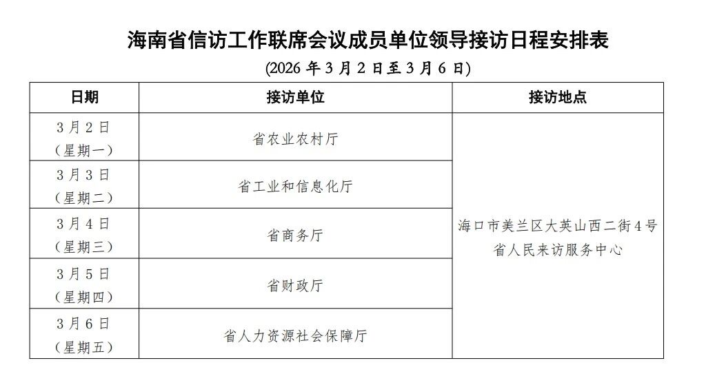 3月2日至6日,省农业农村厅、省工业和信息化厅、省商务厅、省财政厅、省人力资源社会保障厅相关负责人将在海南省海口市美兰区大英山西二街4号省人民来访服务中心接访群众。具体日程安排如下表。