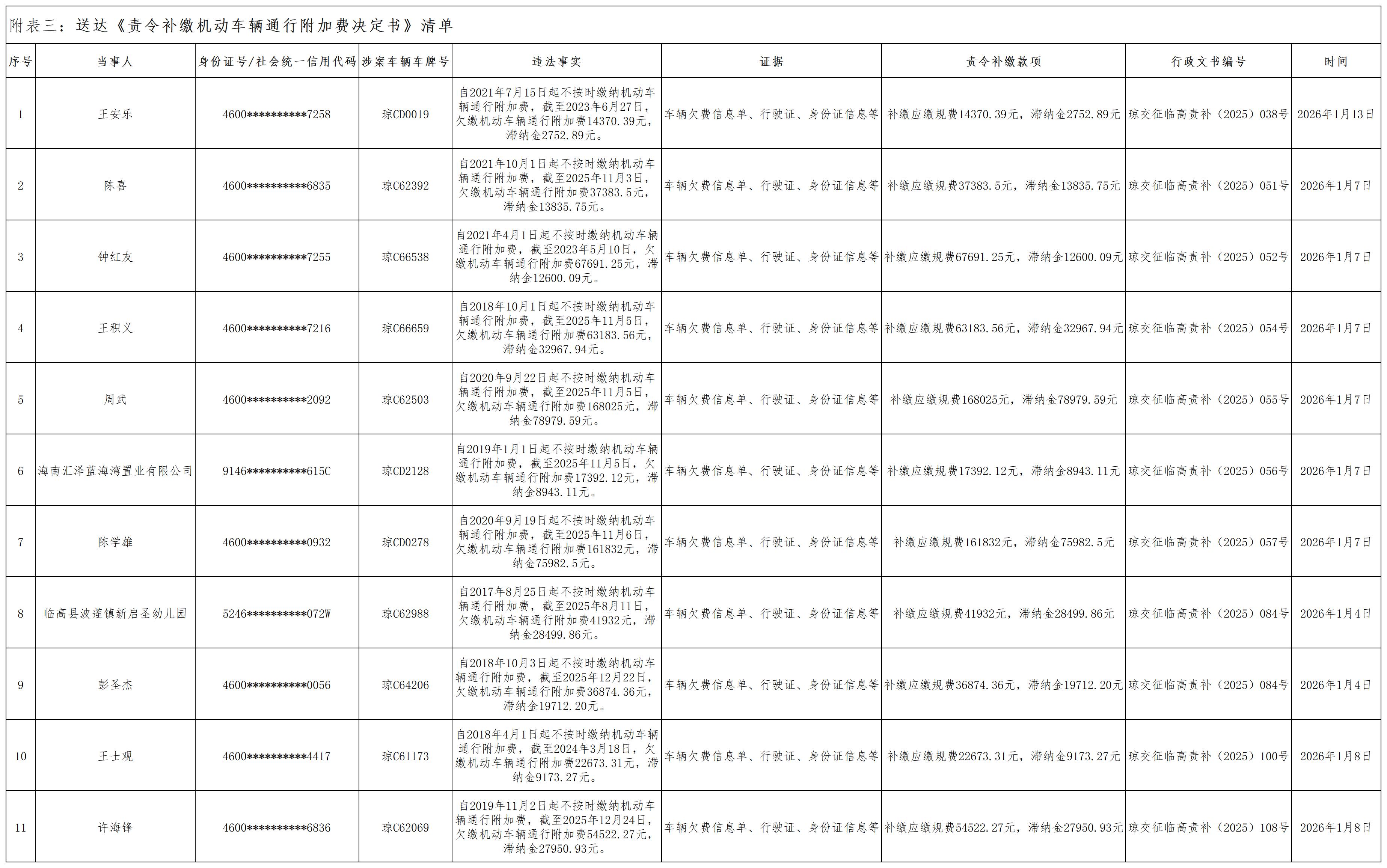 因下列欠缴机动车辆通行附加费当事人不按时缴纳机动车辆通行附加费(具体欠费信息详见附表一:送达《限期补缴机动车辆通行附加费通知书》清单),违反了《海南经济特区机动车辆通行附加费征收管理条例》第九条、第十一条的规定,根据《海南经济特区机动车辆通行附加费征收管理条例》第二十六条的规定,向下列欠缴机动车辆通行附加费当事人送达《限期补缴机动车辆通行附加费通知书》,限下列欠缴机动车辆通行附加费当事人在收到本通知书之日起十日内到本单位补缴应缴费额、滞纳金(两项具体金额以实际缴纳之日为准)。现因本单位采取其他方式无法向下列欠缴机动车辆通行附加费当事人送达《限期补缴机动车辆通行附加费通知书》,特依法予以公告送达,公告期为30日,请下列欠缴机动车辆通行附加费当事人自公告之日起30日内来海南省交通规费征稽局临高分局领取《限期补缴机动车辆通行附加费通知书》,公告期满即视为送达。