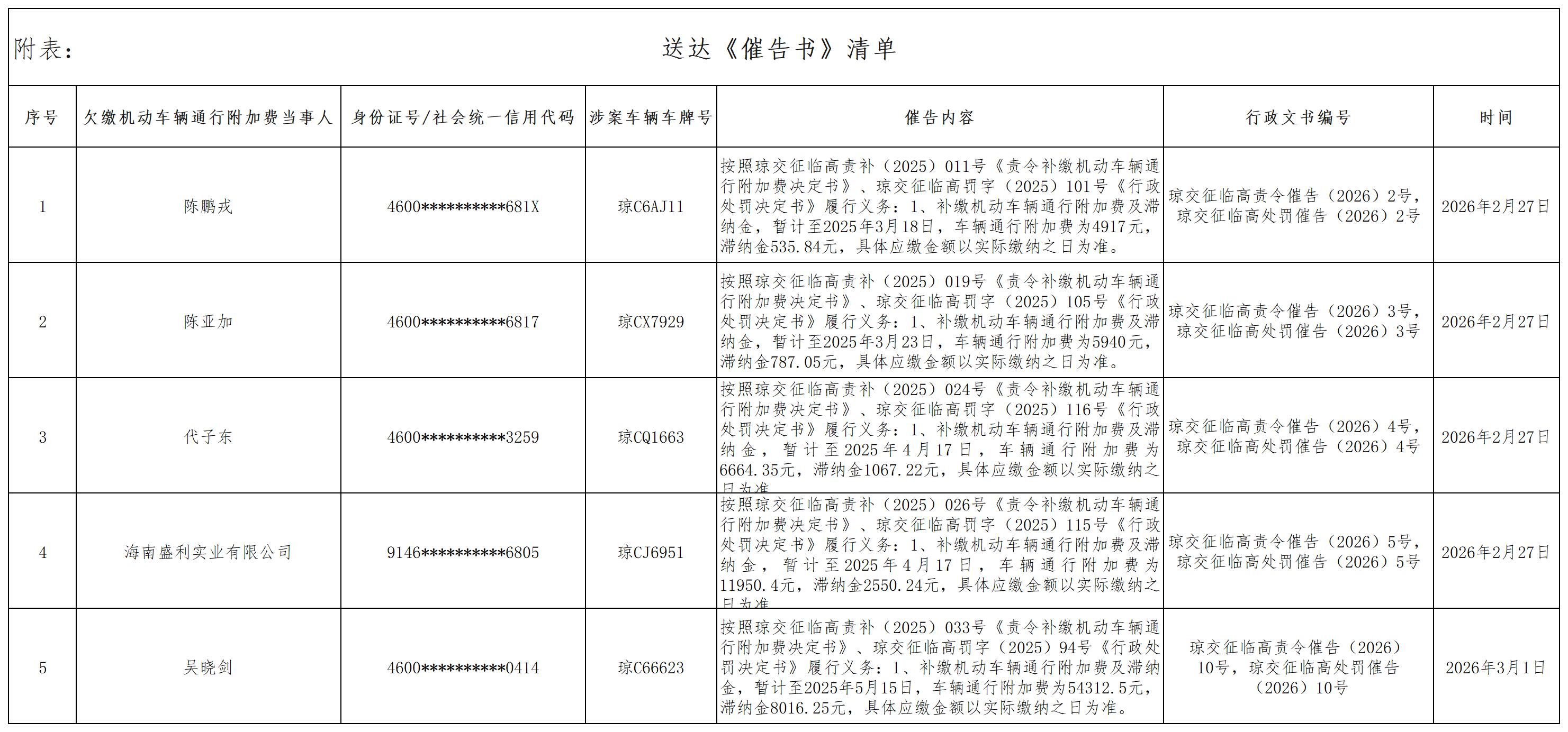 现因本机关采取其他方式无法向下列欠缴机动车辆通行附加费当事人送达《责令补缴机动车辆通行附加费决定书》,特依法予以公告送达,公告期为30日,请下列欠缴机动车辆通行附加费当事人自公告之日起30日内来海南省交通规费征稽局临高分局领取《责令补缴机动车辆通行附加费决定书》,公告期满即视为送达。