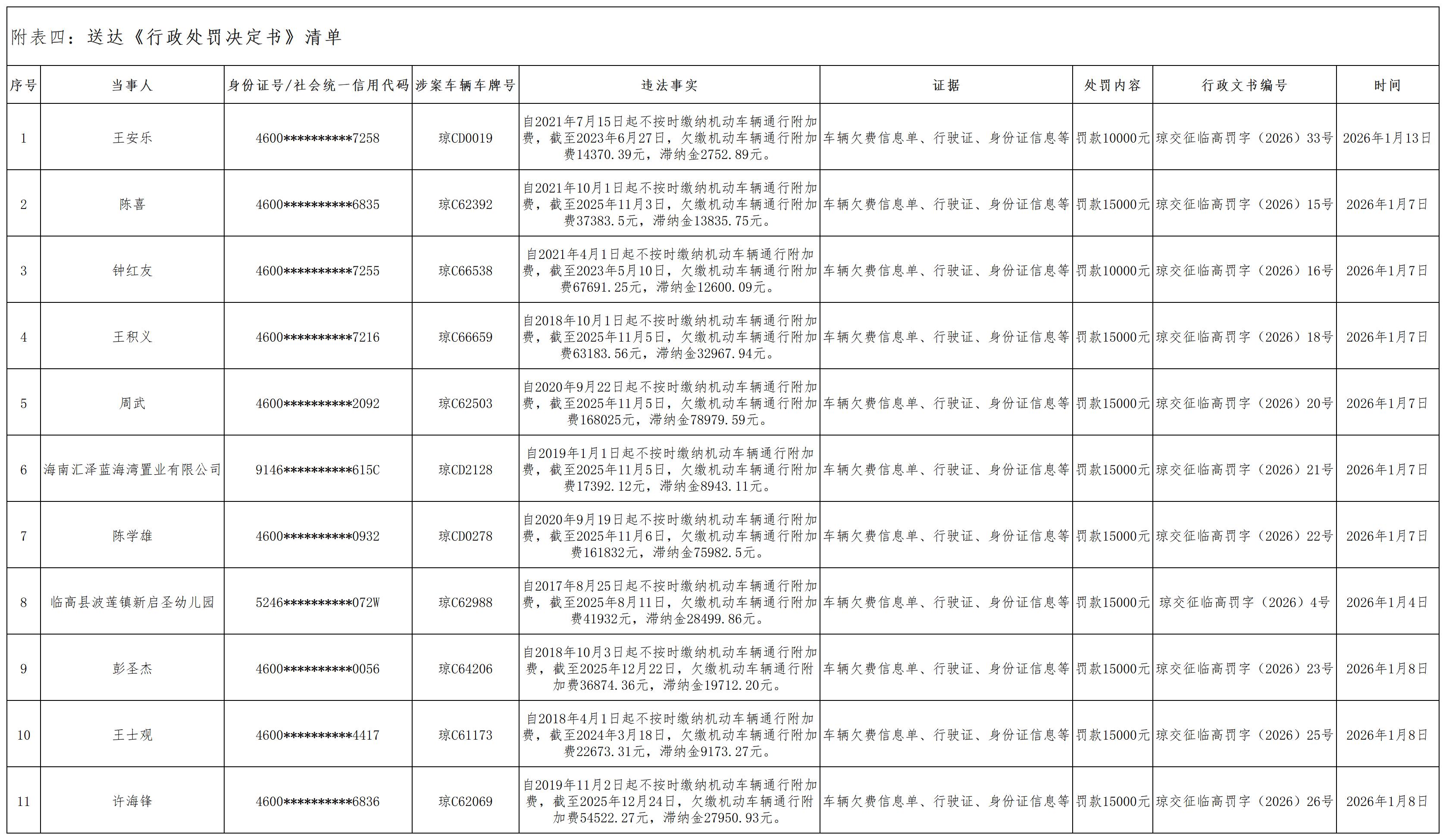 因下列违法行为当事人未按时缴纳机动车辆通行附加费(具体车辆信息及处罚决定详见附表:送达《行政处罚决定书》清单),违反了《海南经济特区机动车辆通行附加费征收管理条例》第九条、第十一条的规定,本单位依据《海南经济特区机动车辆通行附加费征收管理条例》第二十六条,对下列违法行为当事人作出以下行政处罚决定。现因本机关采取其他方式无法向下列违法行为当事人送达《行政处罚决定书》,特依法予以公告送达,公告期为30日,请下列违法行为当事人自公告之日起30日内来海南省交通规费征稽局临高分局领取《行政处罚决定书》,公告期满即视为送达。