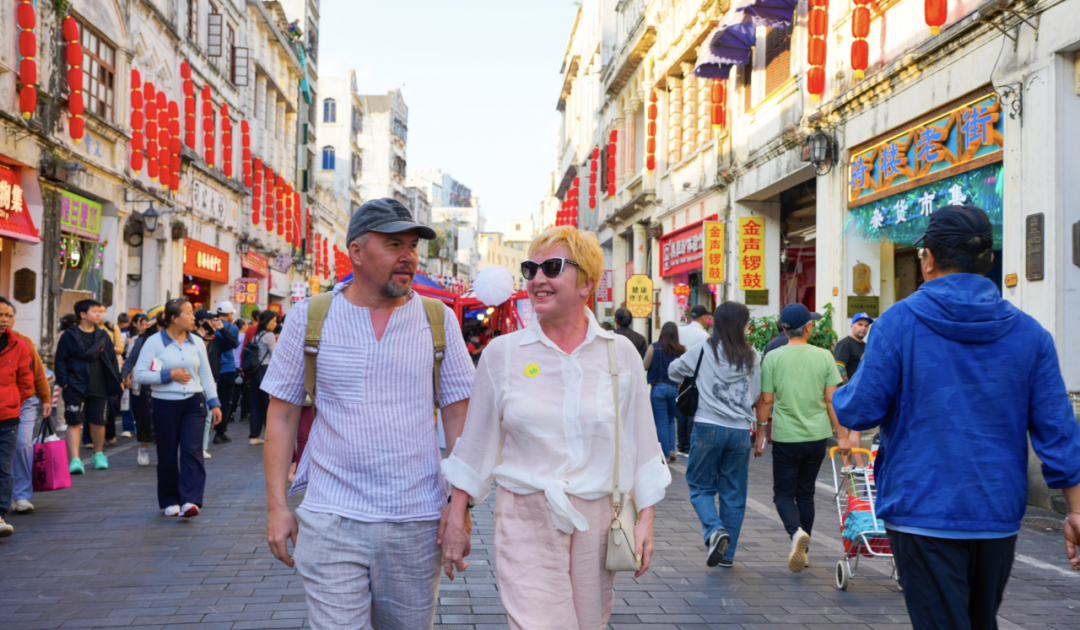 近日,海口市中山路百年骑楼老街张灯结彩,吸引众多外国游客。海南日报全媒体记者 张茂 摄