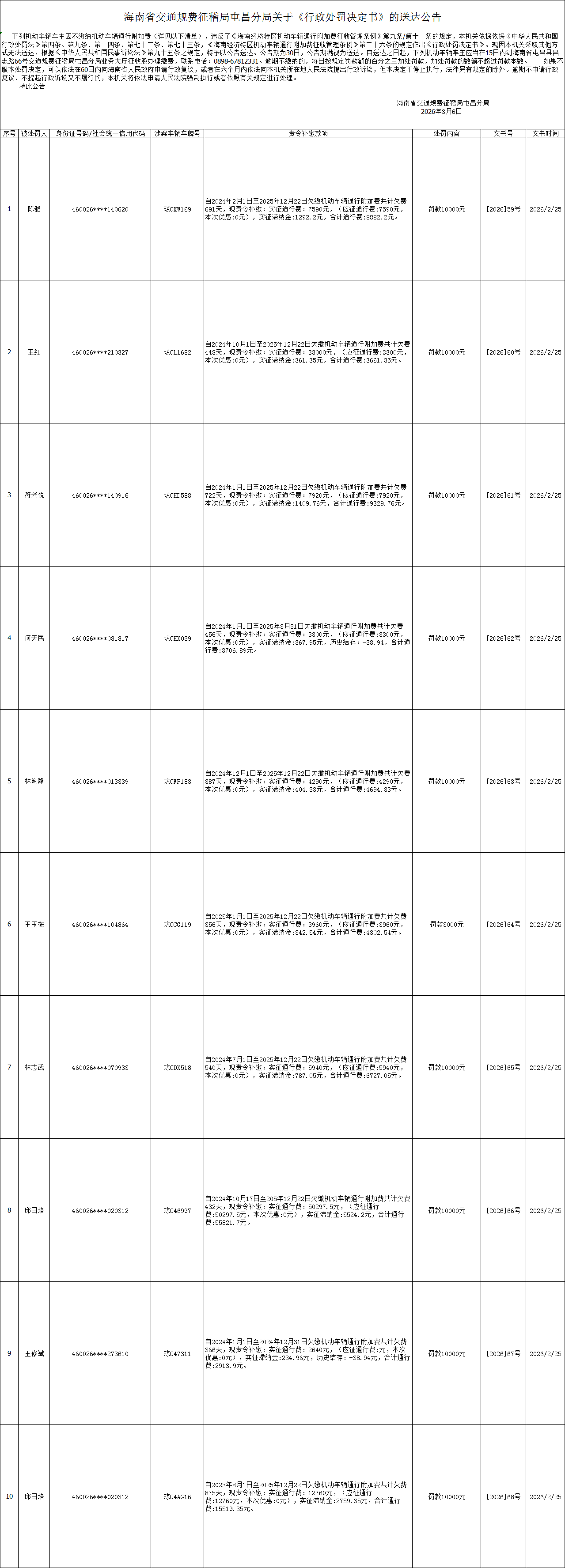 海南省交通规费征稽局屯昌分局关于《行政处罚决定书》的送达公告