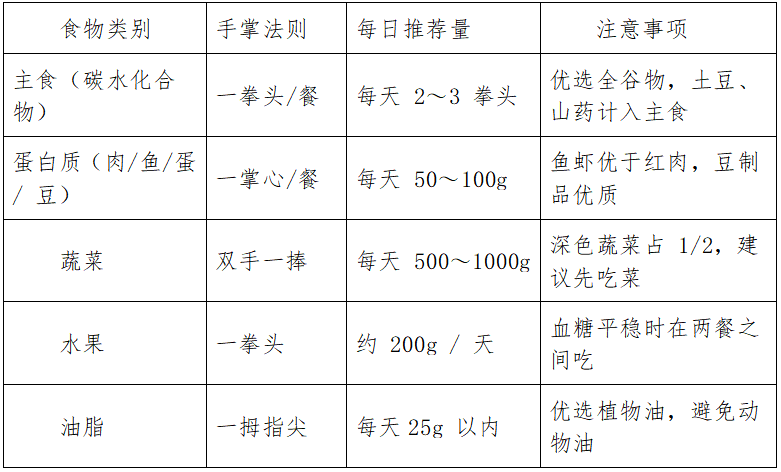 “手掌法则”是一种直观的饮食管理方法,通过比较食物与手部的比例来帮助糖友控制热量摄入。用自己的手,量自己的食物——因为每个人的手大小与体型相关,这是一种高度个体化的估算方法。