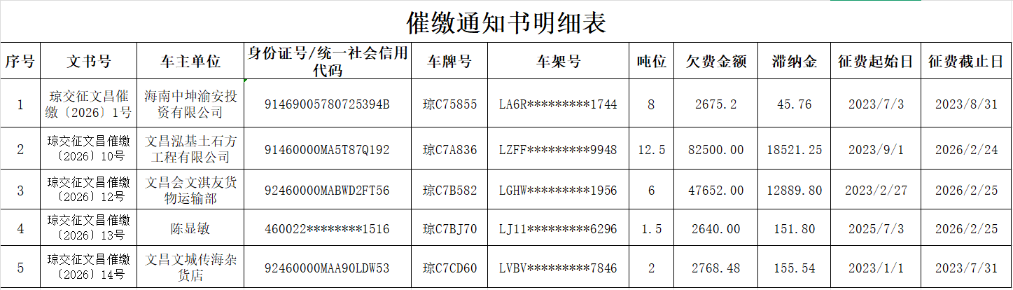 海南省交通规费征稽局文昌分局关于送达催缴通知书的公告