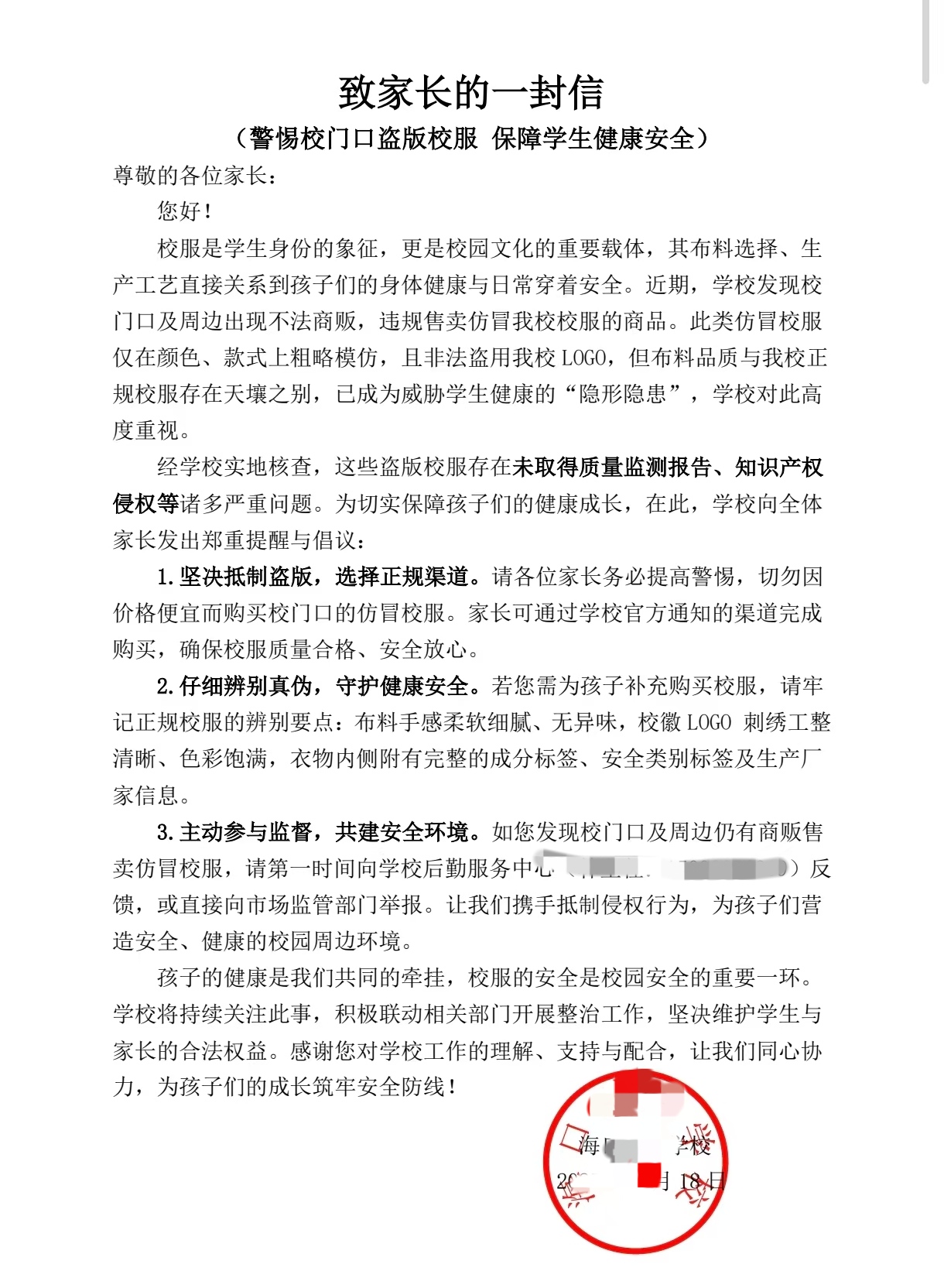 海口一小学致学生家长的一封信中,倡议家长警惕“盗版校服”,保障学生健康安全。受访人供图