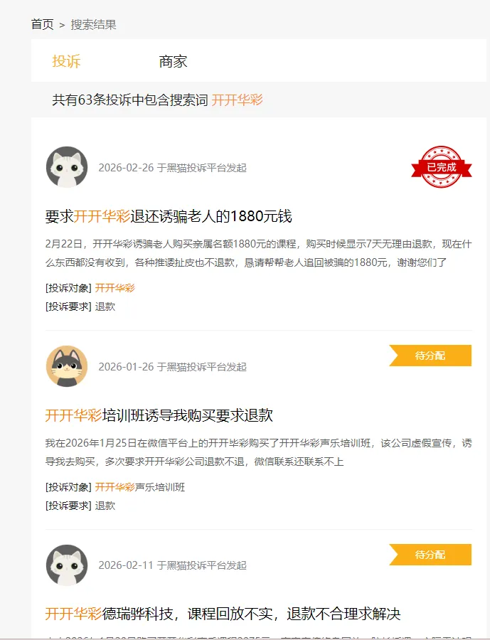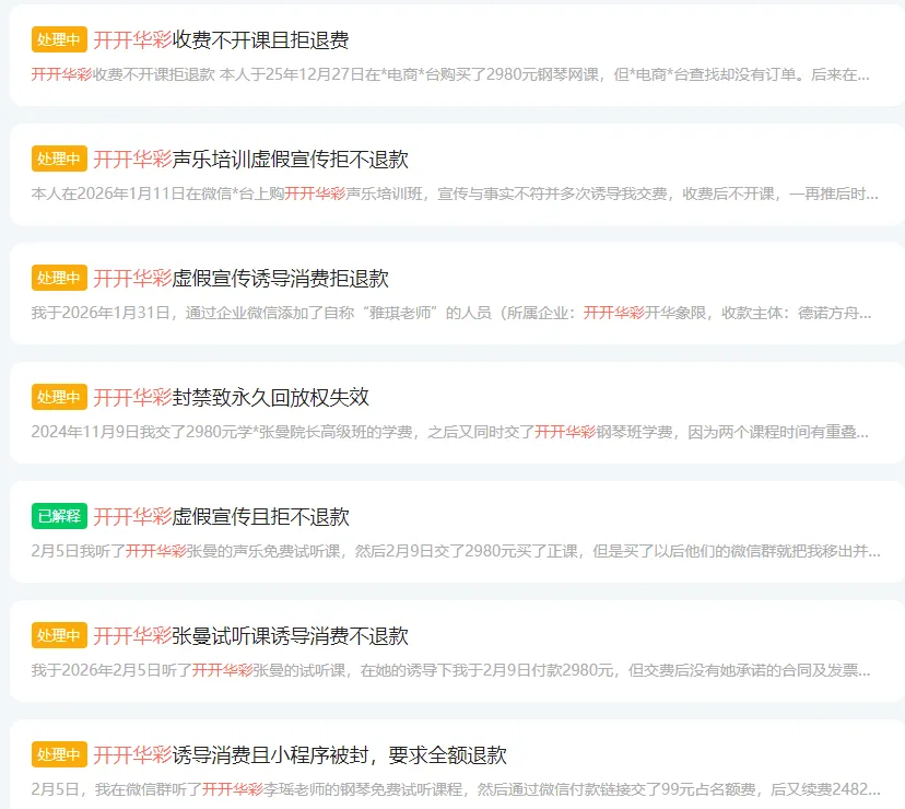 此外,投诉数据同样引人深思:消费保关于开开华彩的投诉有35条,多数显示处理中;黑猫投诉平台相关投诉达63条。抖音、小红书等社交平台亦有不少用户发帖投诉,关键词多集中在“诱导消费”“拒不退款”“微信失联”等方面。