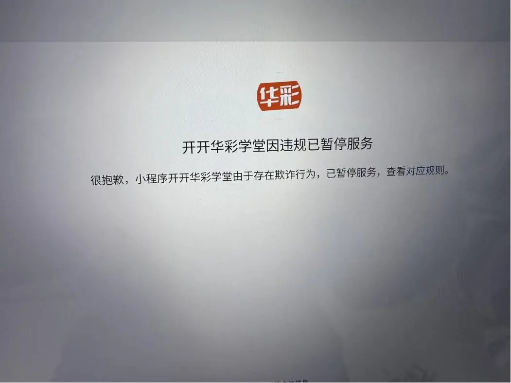 此外,硬件销售也成为新的利润增长点。有消费者投诉,家中老人在诱导下花费3999元购买了一台由“开开华彩”出品、声称由联想代工的学习机。而市场上同配置的普通平板价格仅为该价格的一半左右,老人显然为“上课专用”的概念支付了高额溢价。更令人担忧的是,消费者发现学习机内置的“开开华彩学堂”App曾提示“因违规已暂停服务”,关联的小程序也显示“由于存在欺诈行为,已暂停服务”。虽然平台迅速更新了版本,但这种“换壳”操作无疑为其合规性打上了问号。