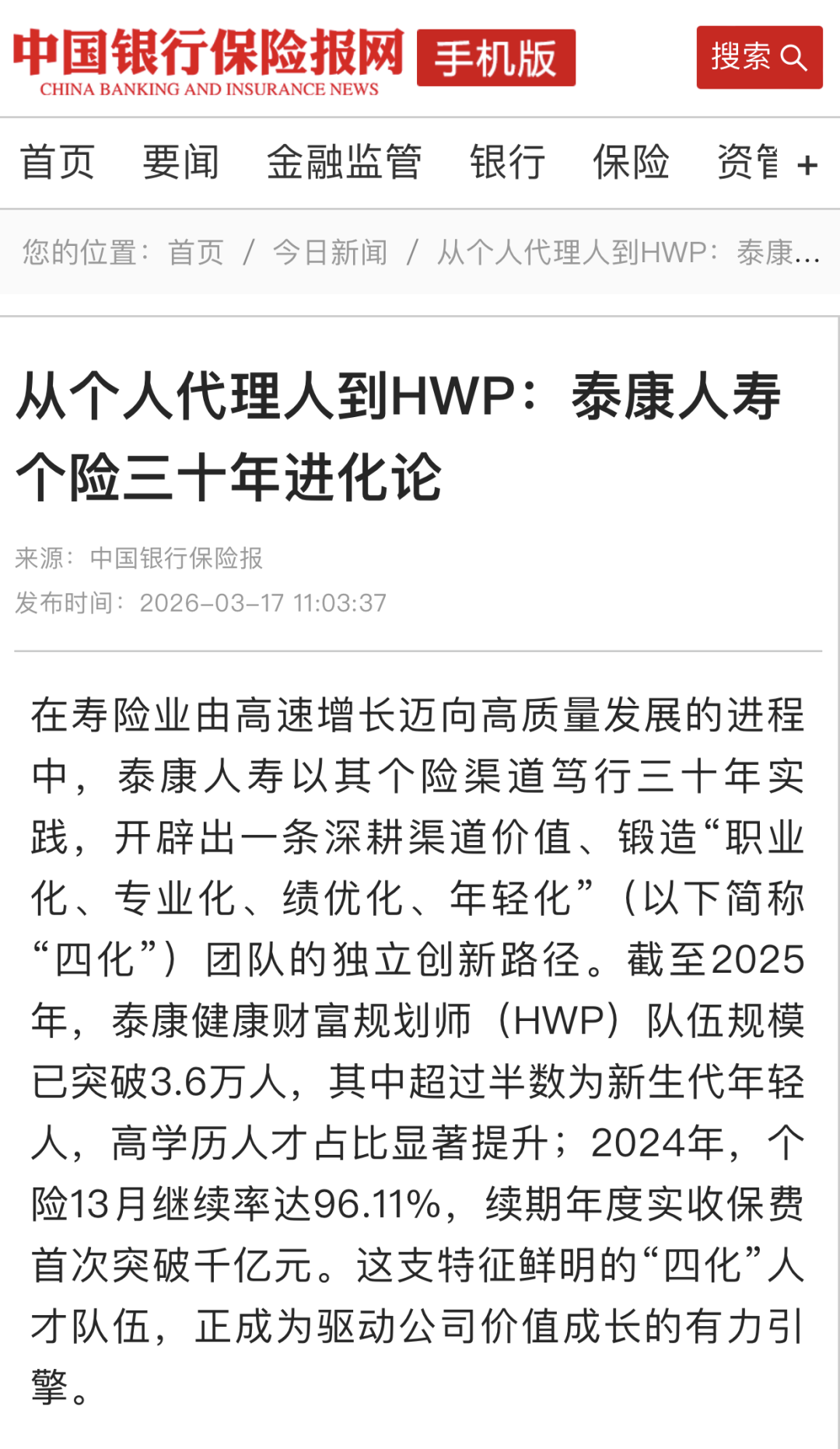 回溯泰康个险三十年的发展历程,HWP的成功并非偶然,而是一场始于高起点、成于战略定力、跃升于生态赋能的系统性变革。它不仅重塑了保险代理人的职业内涵,更通过“支付+服务+投资”三端协同的新寿险模式,为行业高质量发展提供了可供借鉴的“泰康样本”。