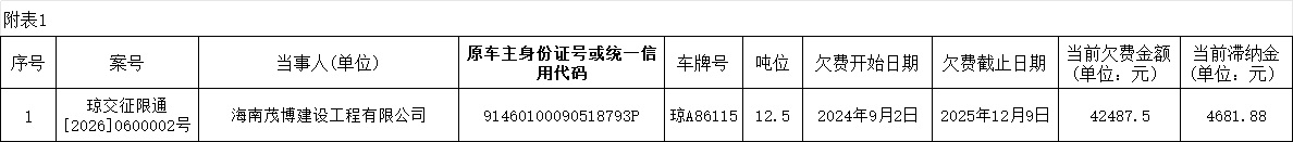 如你(单位)对本机关提供的上述欠费信息无异议,根据《海南经济特区机动车辆通行附加费征收管理条例》第九条第一款、第十一条、第二十六条的规定,限你(单位)在本公告送达之日起15个工作日内到海南省琼海市银波路1号(海南省交通规费征稽局琼海分局)处补缴应缴费额、滞纳金(应缴费额、滞纳金两项具体金额以实际缴纳之日为准)。联系电话:0898-62931309。
