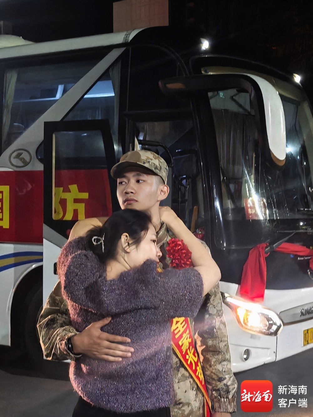 3月18日凌晨5时04分,陵水新兵开始起运至琼海市红色娘子军纪念园参加海南省2026年上半年新兵欢送仪式。在从陵水上车前,一位母亲紧紧拥抱儿子,将不舍与牵挂尽数融入怀中。