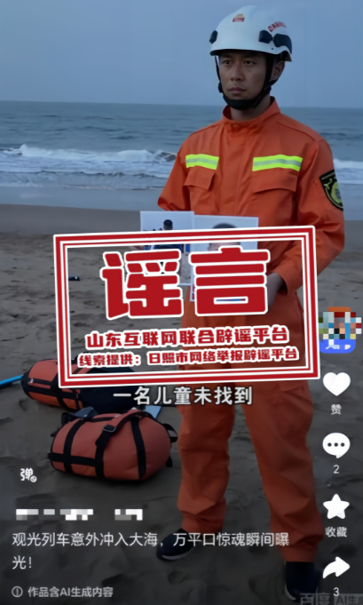 3月17日,某网民在社交平台发布视频“观光列车意外冲入大海,万平口惊魂瞬间曝光!”,视频中称“山东日照万平口景区突发观光列车入海事件,有游客受伤失踪,失联人员含杭州摄影团队、合肥亲子游家庭,具体伤亡数字应急管理局暂未公布,请等待官方通报”,并配以AI生成画面,引发网民讨论。